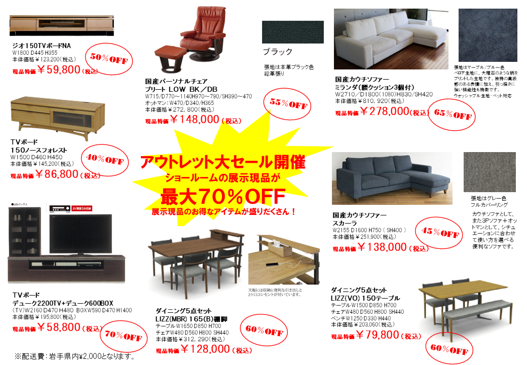 ・オープン5周年感謝セール:展示現品最大70%OFF