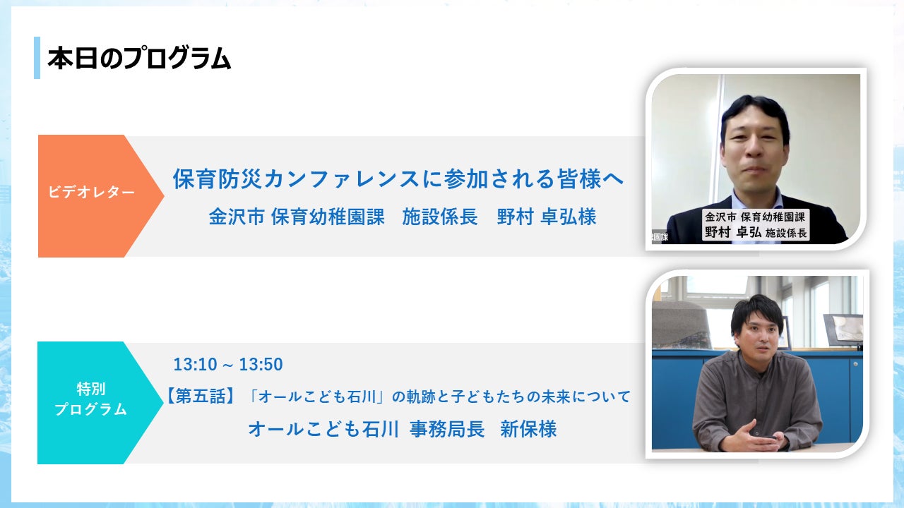 最終日となる本日のプログラムでは、金沢市 保育幼稚園課の野村様より保育者の皆様へのビデオレターと特別プログラムとして、オールこども石川 事務局長の新保 雄希様の取材動画を放映します。