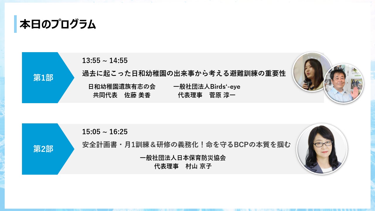 第一部、第二部は保育防災や、保育のBCP(事業継続計画)についての専門家・有識者の方にご登壇いただき、なぜ「保育防災」に取り組む必要があるのか、子どもたちの命を守るための備えについてお伝えします。