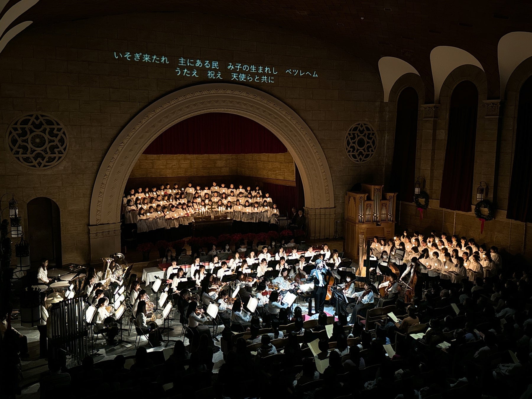 重厚かつ温柔なパイプオルガンの前奏が続くなか、舞台上で厳かに灯が受け渡されるキャンドルサービスが行われてクリスマス礼拝が始まりました。音楽学部オーケストラの演奏に乗って合唱が、そして選ばれたソリストによる独唱と美しい歌声が響きます。