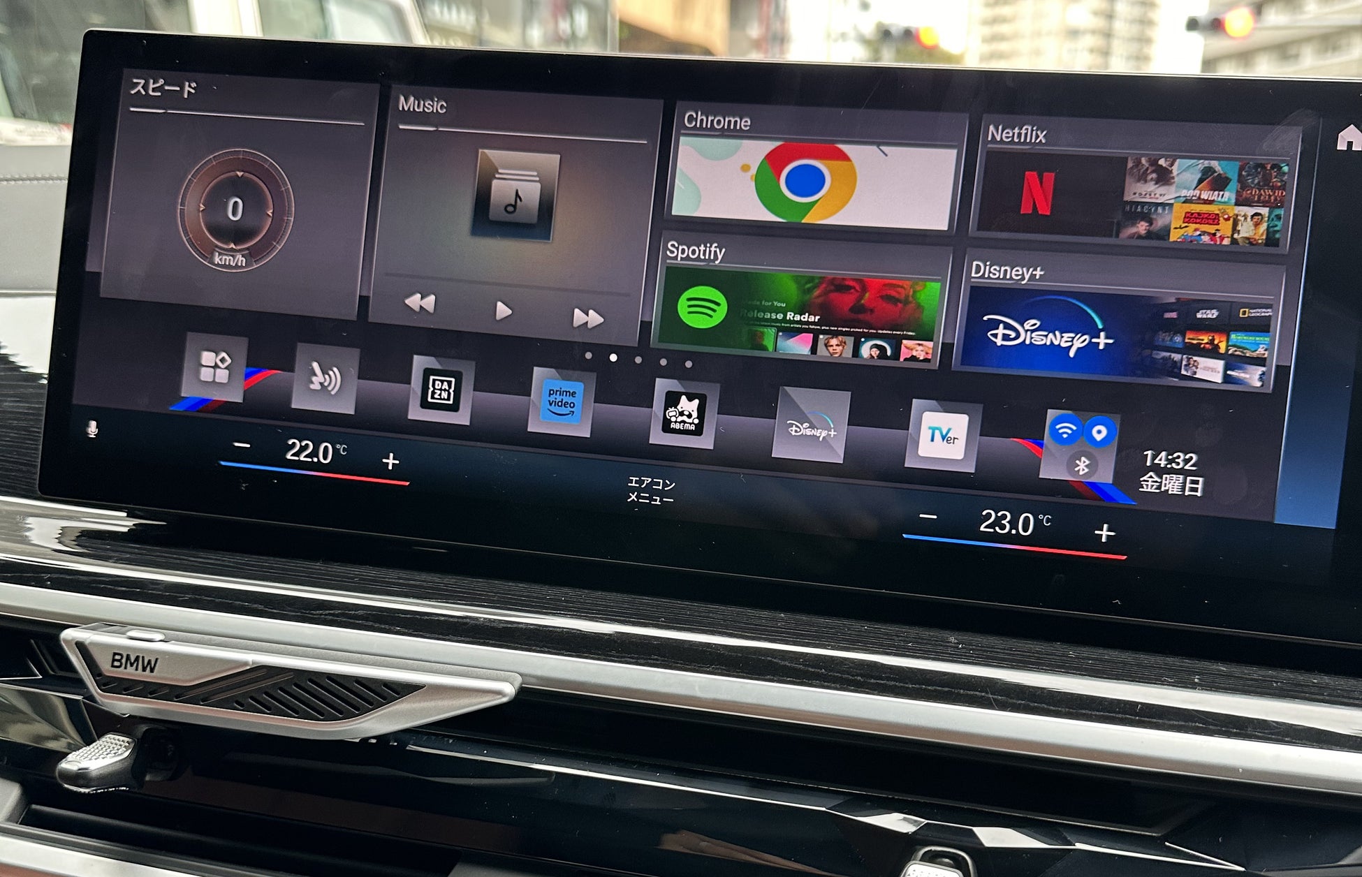 近年のBMW車両に標準搭載されるWireless Carplayに接続し、Amazon Prime、Netflix等の各種サブスクリプションをお楽しみ頂けるAndoroidインターフェース