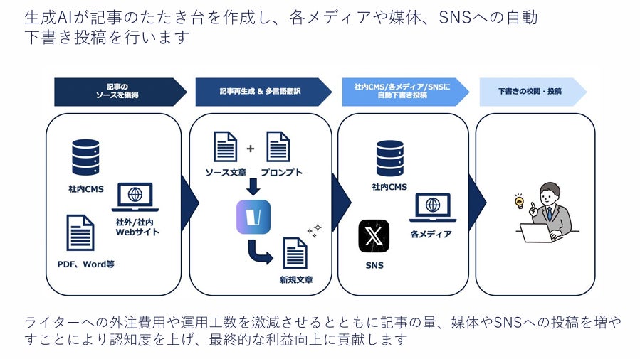 ユーザーが指定したテーマや記事に基づいて、高精度な記事の下書きを多言語にて自動生成します。また、日本国内のみならず世界各国の各メディアや媒体、SNSへの自動下書き投稿も可能で、これにより記事作成や情報発信にかかる工数を大幅に削減します。