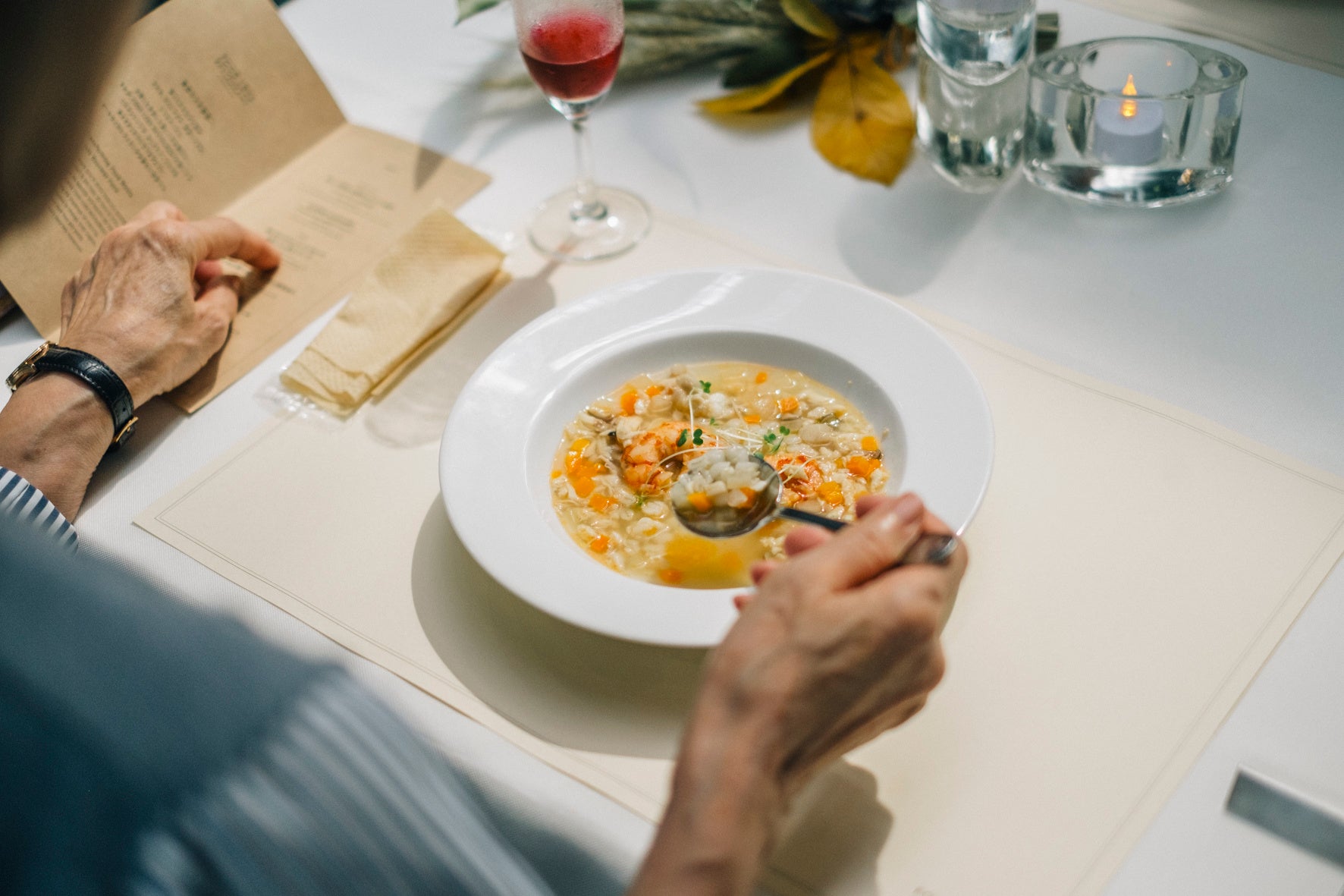 「鯛のあら&丸ごとエビ出汁の根菜ともち麦入スープ」※小麦、えび