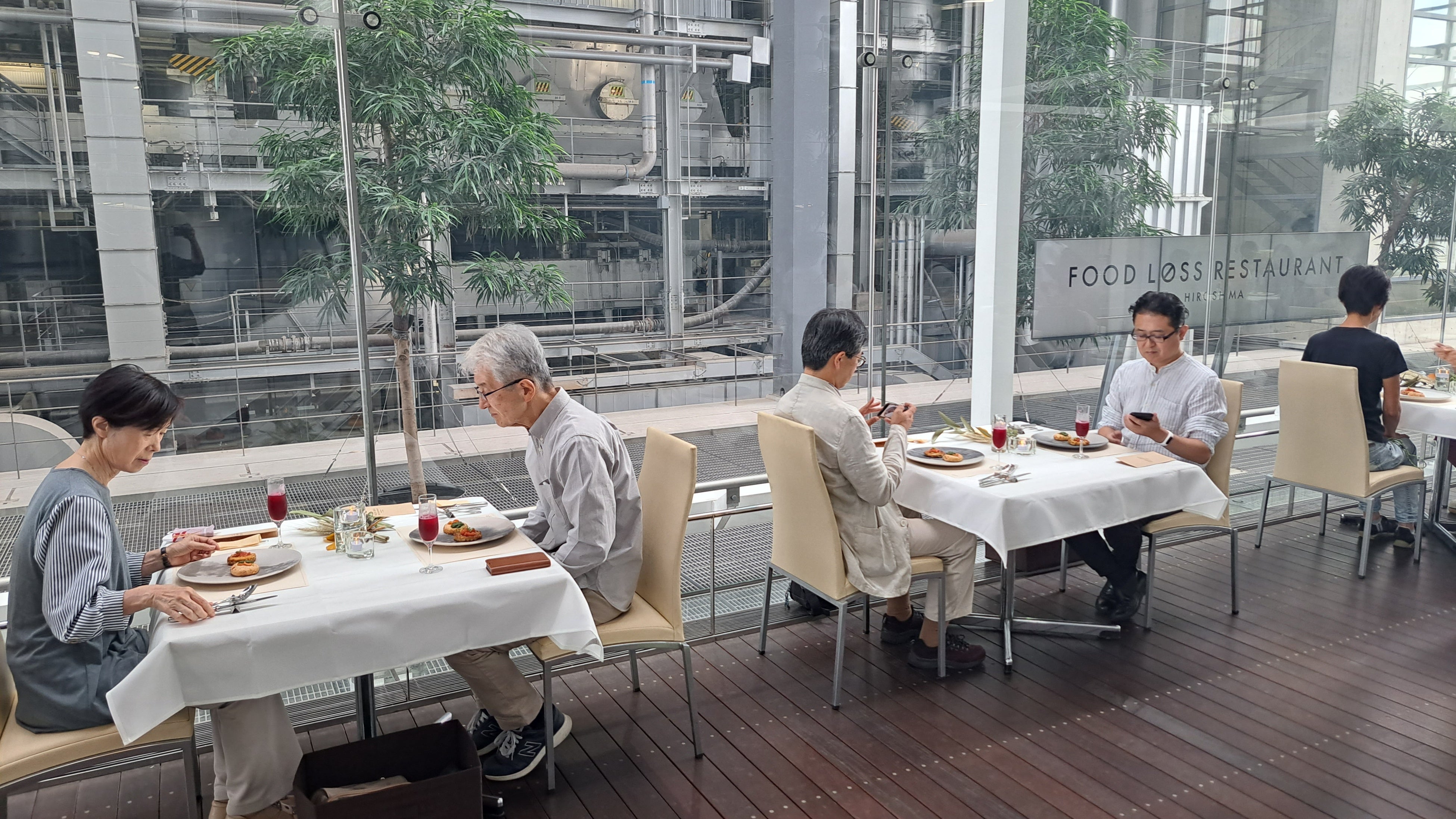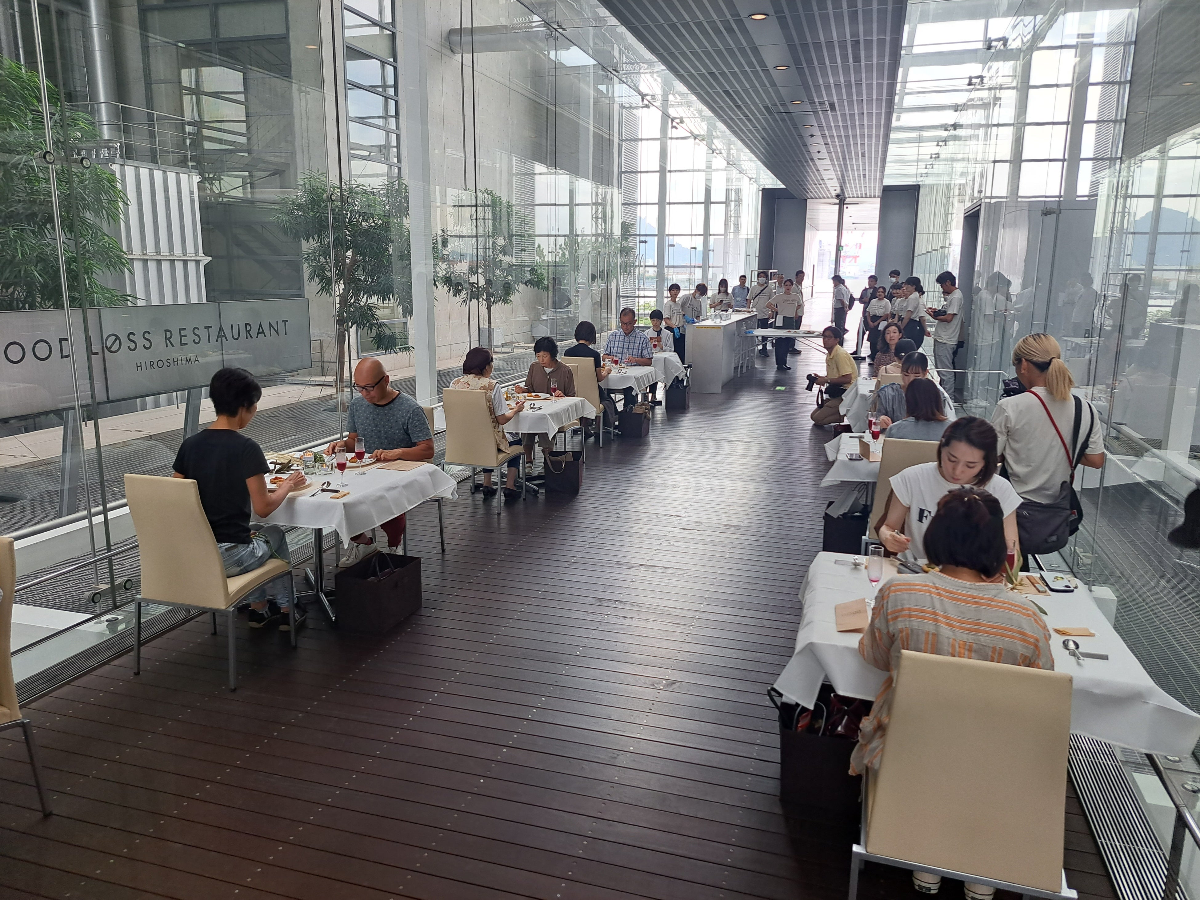 その後参加者は、会場となる中工場2階のガラスで囲われた通路「アクアリウム」に移動し、そこに特別に設営された1日限定レストラン「FOOD LOSS RESTAURANT HIROSHIMA supported by 広島ガス」で、フードロス食材で考案されたオリジナルメニューを堪能しました。