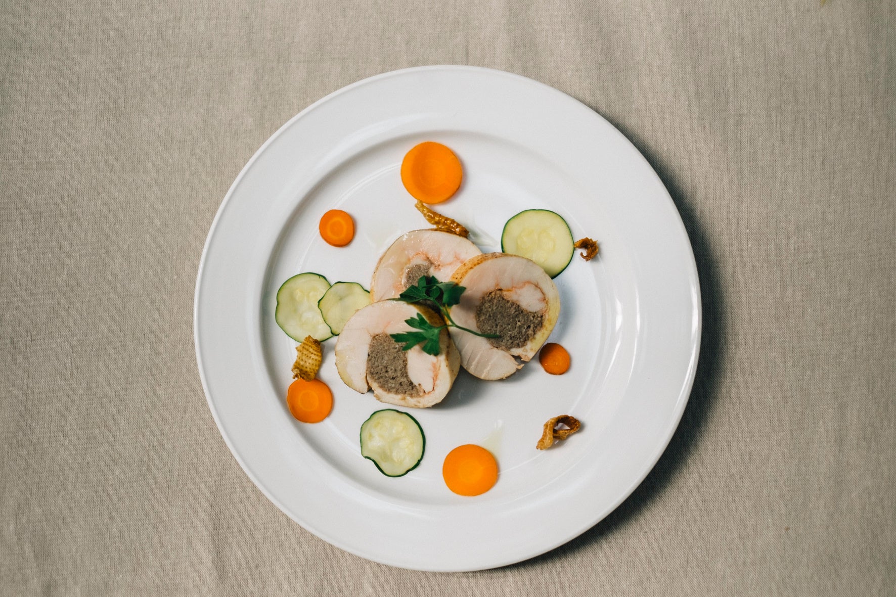 メインは、牛肉や豚肉などの残ったお肉にバターと香辛料を加え、フードプロセッサー等で撹拌しパンに塗ったりできるリエットに仕上げたそれを鳥のむね肉にロールし蒸し焼きにした「色々お肉の鶏むねロール 彩り野菜添え」。