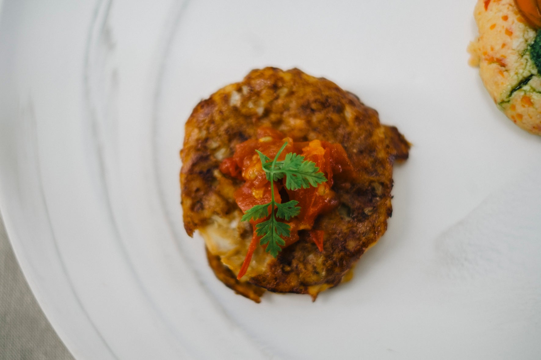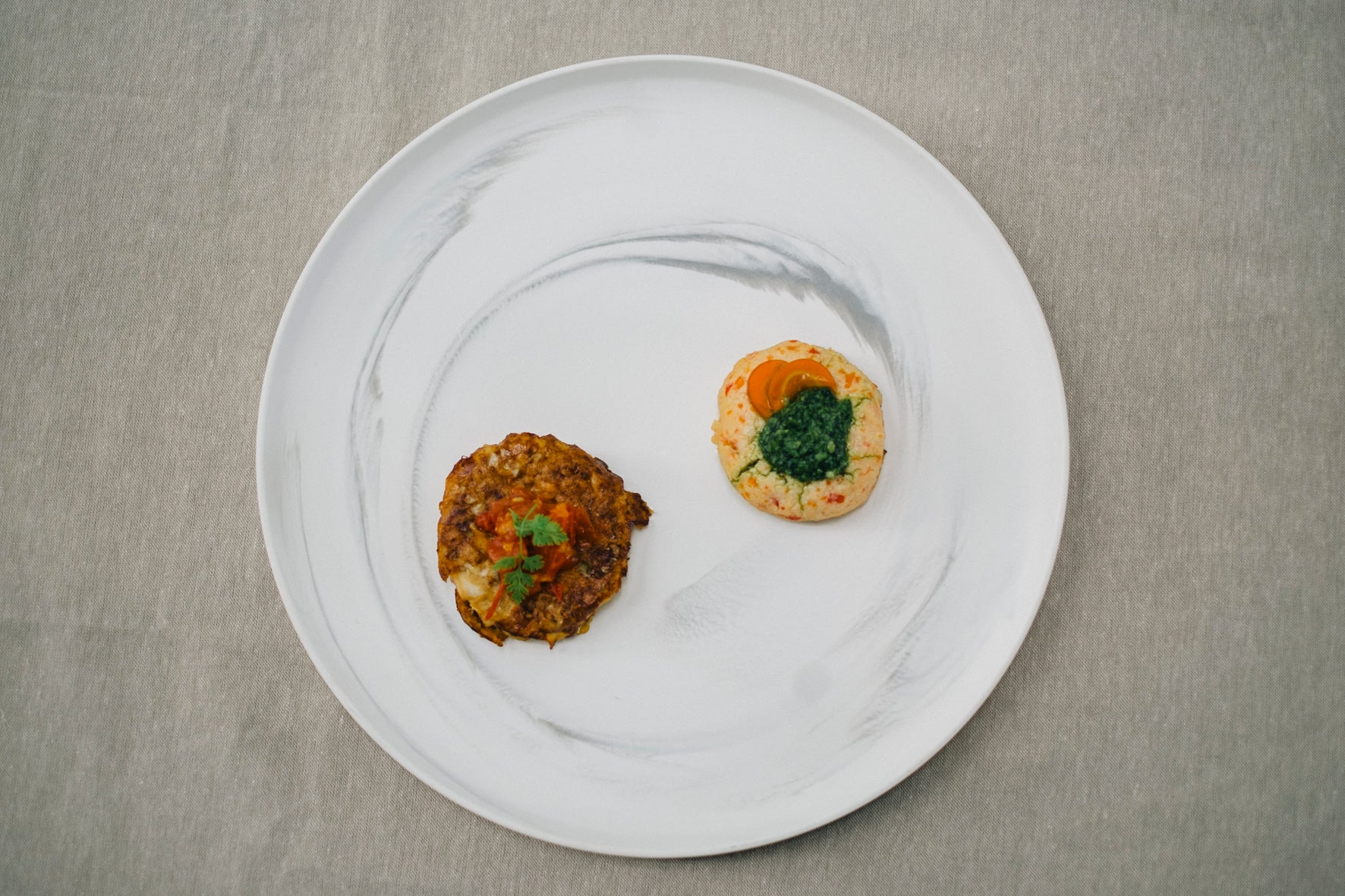 まず提供されたのは、オードブルの2品。廃棄されがちな魚である(クロダイ/チヌ)を使った「未利用魚のお好み焼きProduced by ZACO project」と、家庭廃棄で多いといわれている豆腐と色々な野菜をフードプロセッサーで細かくした「端っこ野菜と豆腐のカラフル焼き ジェノバソースのせ」です。