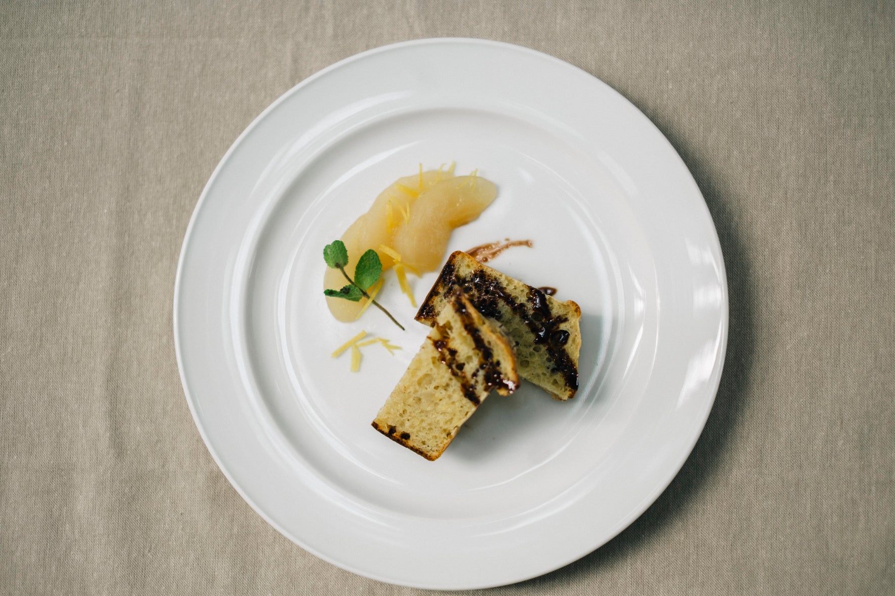 最後に家庭廃棄で多いと言われる果物類を使用し「バナナと米粉のパウンドケーキ 梨のコンポート添え」。今回はバナナと米粉をつかった焼き菓子とコンポートした梨と合わせたデザートに仕上げました。