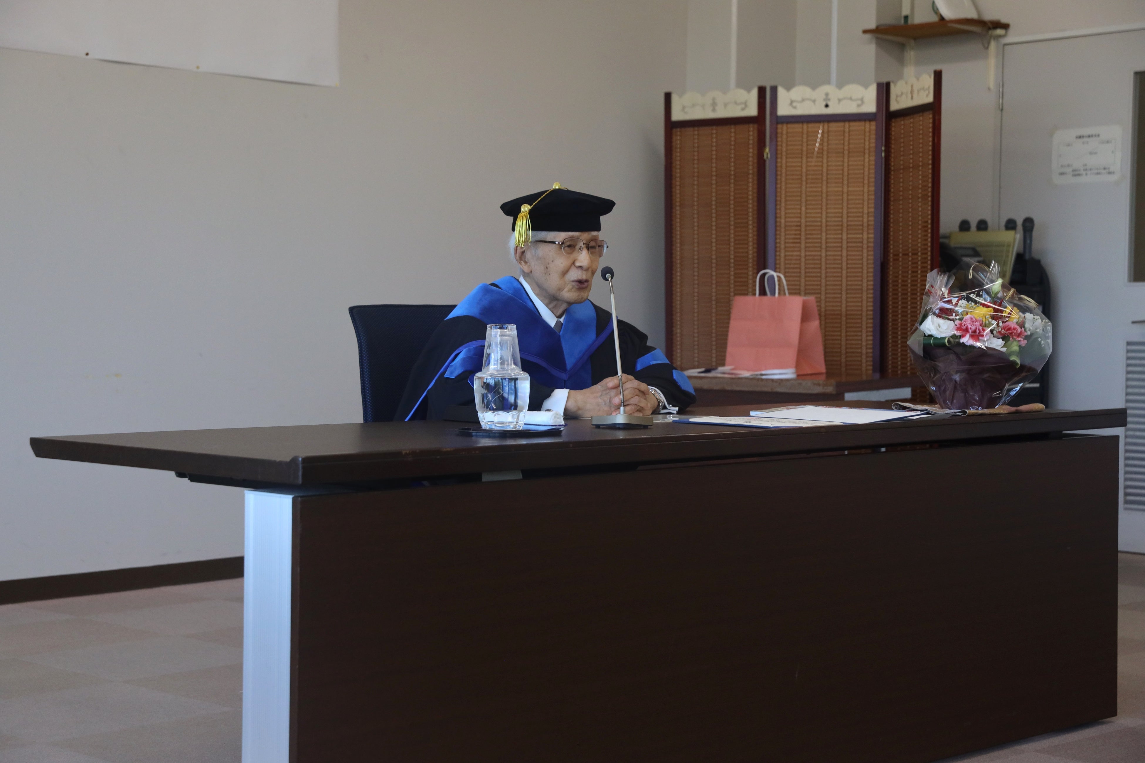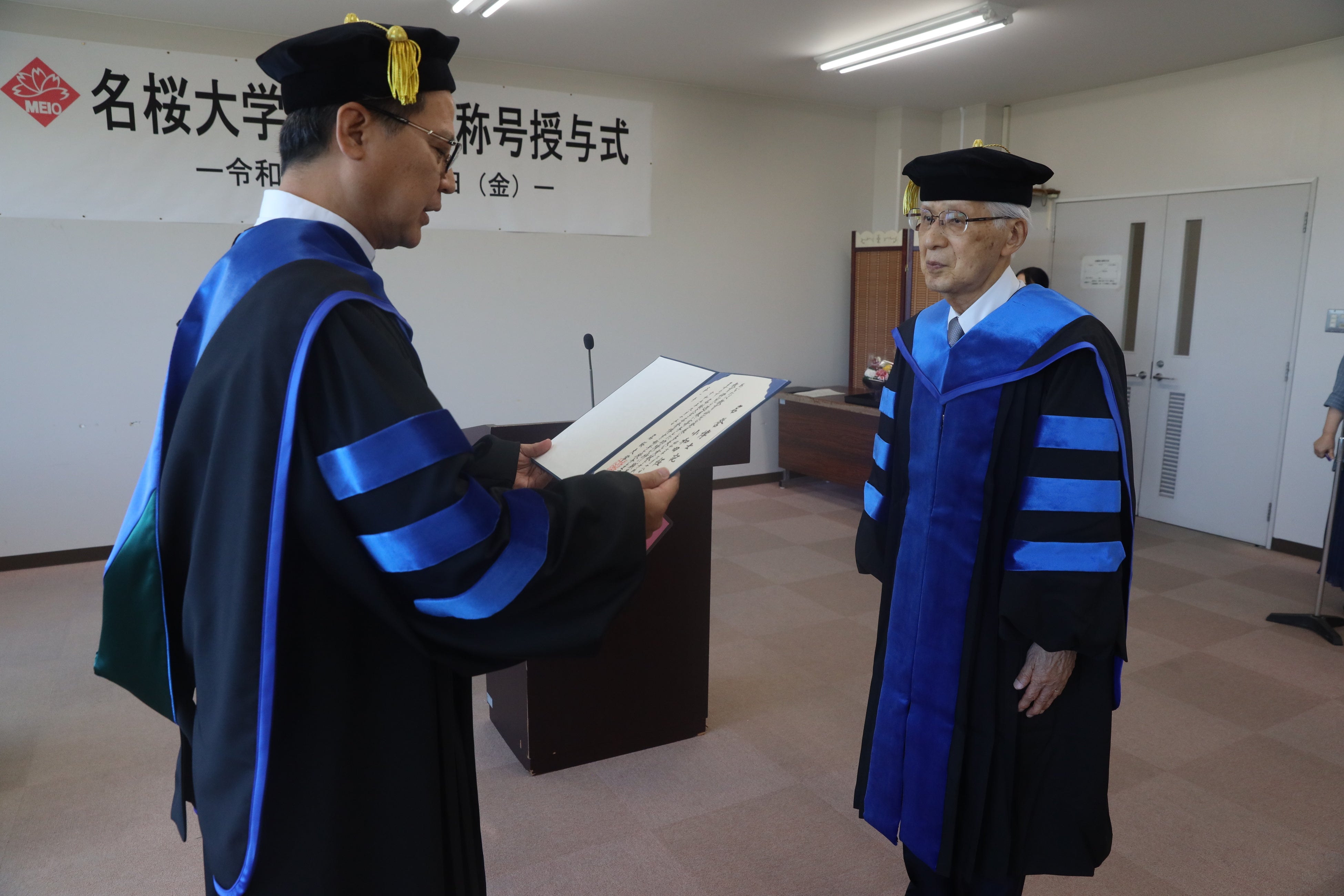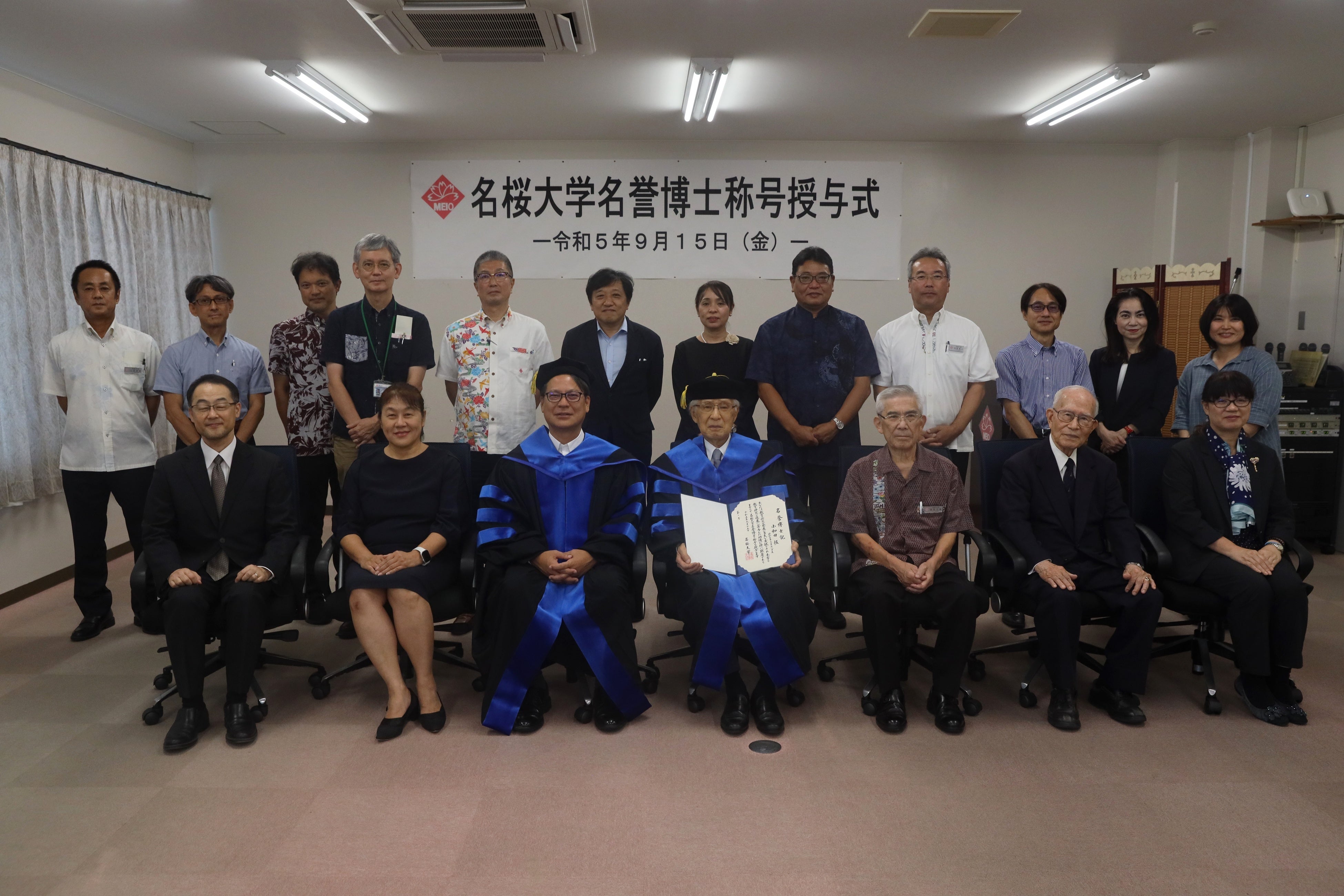式典では、砂川昌範学長より名誉博士称号記が手渡され、砂川学長と高良文雄理事長、瀬名波榮喜名誉学長より本学に対する多大な貢献への感謝とお祝いの言葉が贈られました。
