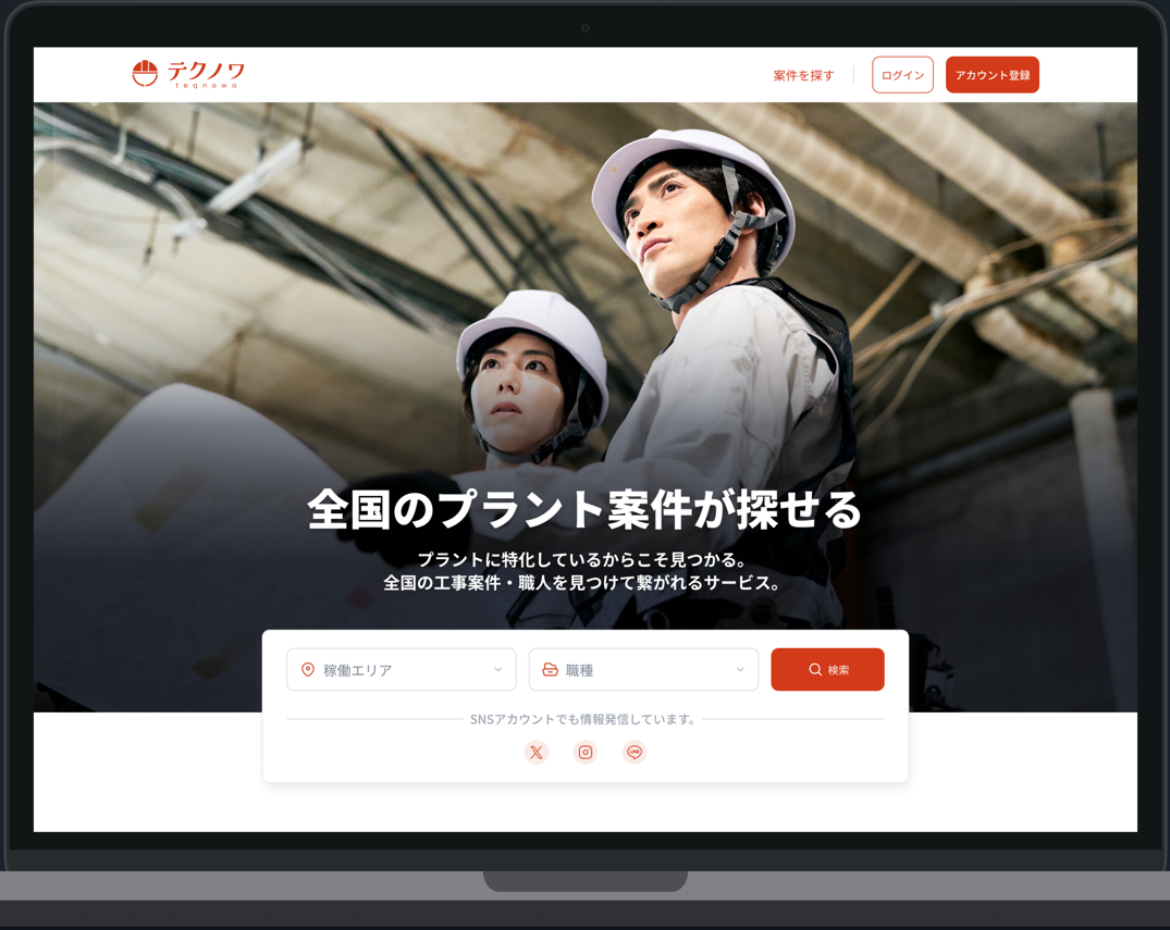 「テクノワ」では企業や職人のマッチングプラットフォームを構築し、今まで取引の無かった企業と繋がり、人手不足の解消や人のツテに頼らなくても日本全国の企業と繋がる事ができ職人や企業がより良い環境でプラント工事に専念できるサービスを目指します。