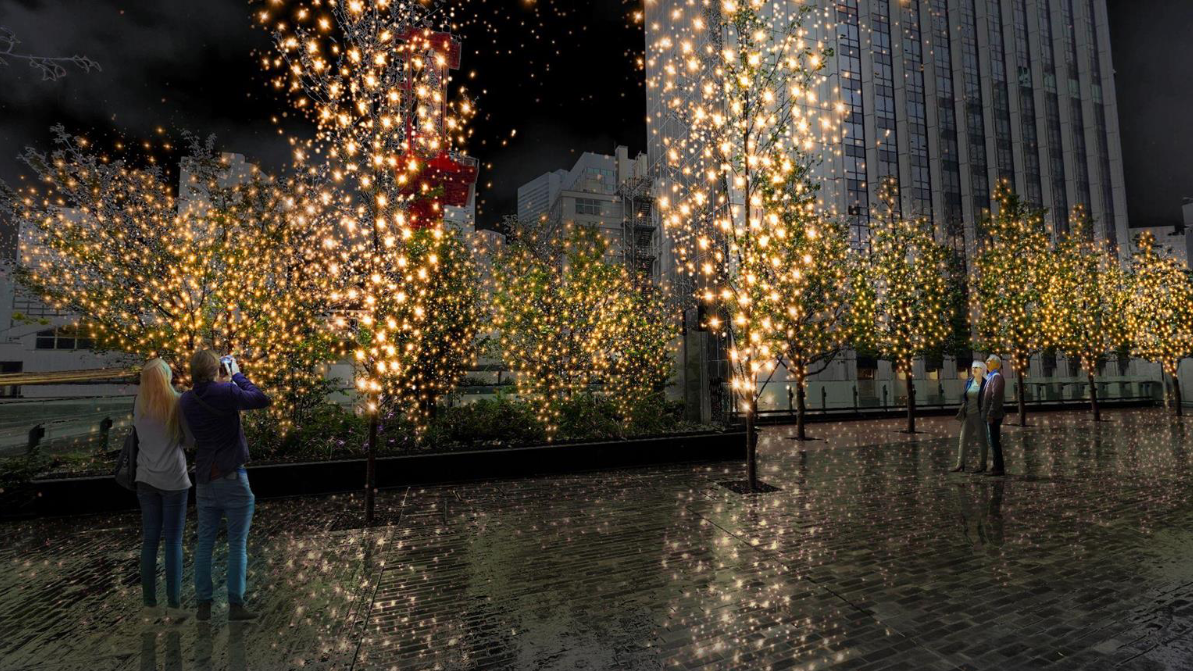 グランドオープンを記念し、同日の日没時より、ペデストリアンデッキやB1Fのサンクンガーデンなどの敷地内にイルミネーションが点灯します。コンセプトは“Brighting people”で、木々から零れ落ちる光が地面や建物、人々をあたたかく染め上げます。田町駅前国道15号沿いにある「新田町ビル」「田町センタービル」「第二田町ビル」敷地と同時点灯を予定しており、田町駅三田口が一斉に、華やかに照らされます。