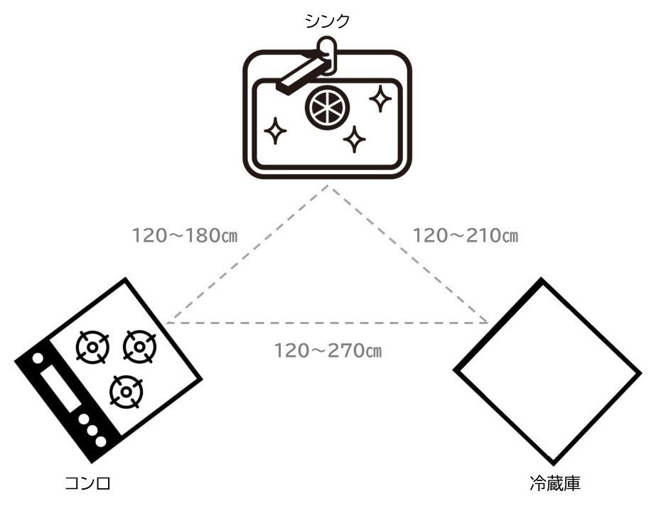 ※1 ワークトライアングルとは、シンク、コンロ、冷蔵庫の3つを結ぶ三角形の動線のこと。この動線が正三角形に近いほど作業効率が良く、3辺の合計が3.6m~6.0mの範囲にあれば、非常に使いやすくなる。