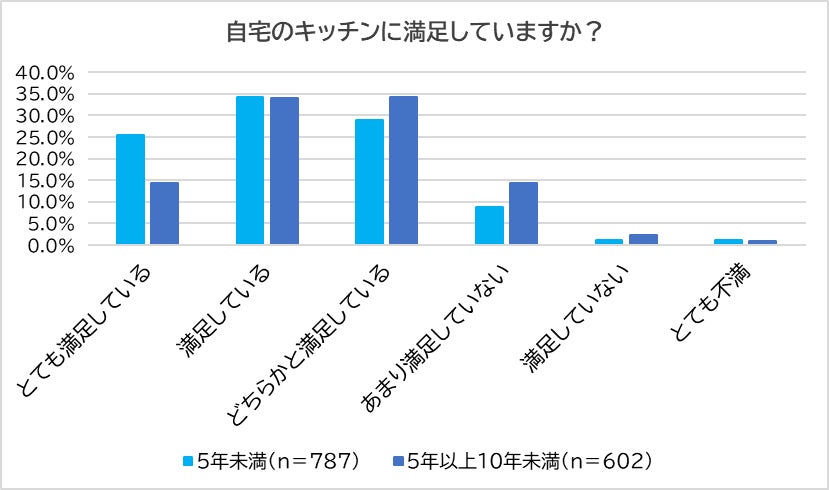 「5年未満」または「5年以上10年未満(以下『10年未満』」と回答した人それぞれに「自宅のキッチンに満足しているか?」尋ねました。どちらも「満足している」(5年未満:34.3%、10年未満:34.1%)、「どちらかというと満足している」(5年未満:28.8%、10年未満:34.1%)が多く、全体的に満足度が高い結果(5年未満:88.7%、10年未満:82.6%)となりましが、年数が経つにつれ満足度が低くなっている点は侮れません。