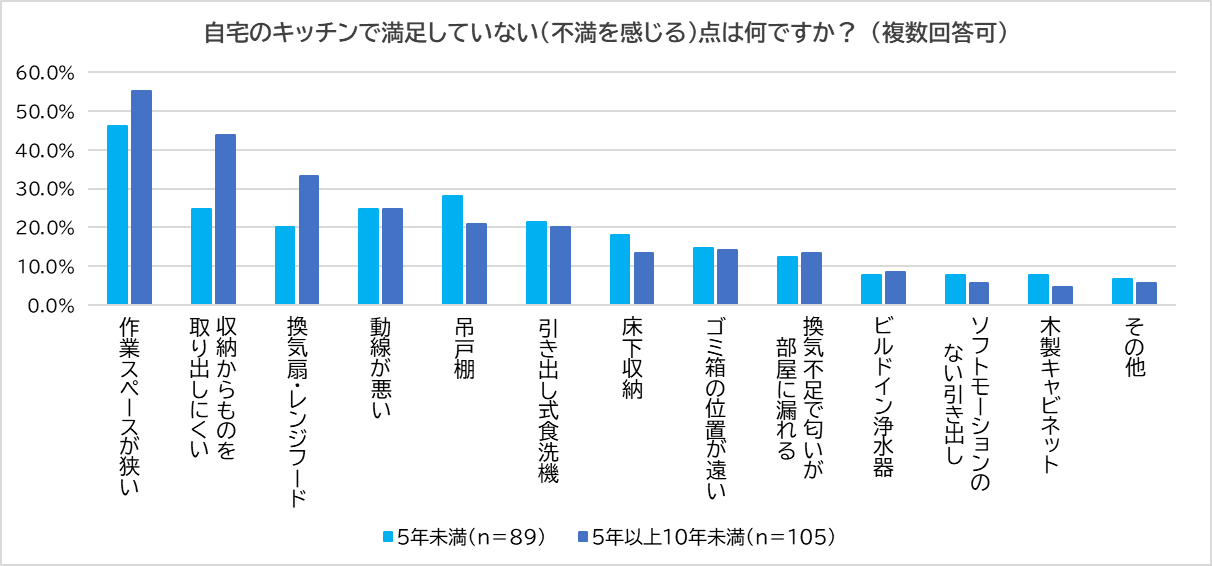 それでは、満足していない人は、何に対して満足していない(不満がある)のでしょうか。最も多かったのは「作業スペースが狭い」(5年未満:46.1%、10年未満:55.2%)と同回答になりましたが、以下5年未満は「吊戸棚」(5年未満:28.1%、10年未満:21.0%)、「動線が悪い」(5年未満:24.7%、10年未満:24.8%)、10年未満は「収納からものを取り出しにくい」(5年未満:24.7%、10年未満:43.8%)、「換気扇・レンジフード」(5年未満:20.2%、10年未満:33.3%)とバラツキました。また、「収納から物を取り出しにくい」「換気扇・レンジフード」は、5年未満よりも10ポイント以上も10年未満の方が多い結果となりました。