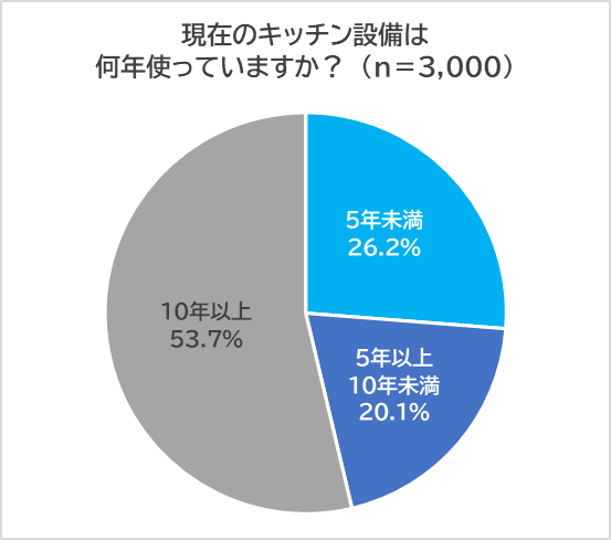 「現在のキッチン設備を使い始めてから何年経つか?」尋ねたところ、「5年未満」(26.2%)、「5年以上10年未満」(20.1%)、「10年以上」(53.7%)となりました。