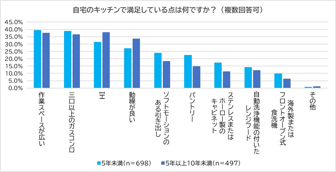 キッチンに満足している人は、どのような点に満足しているのでしょうか。「作業スペースが広い」(5年未満:39.4%、10年未満:37.4%)が共に最多となり、「三口以上のガスコンロ」(5年未満:38.7%、10年未満:36.4%)、「IH」(5年未満:31.2%、10年未満:37.8%)、「動線が良い」(5年未満:26.9%、10年未満:33.4%)、「ソフトモーションのある引き出し」(5年未満:23.8%、10年未満:18.1%)と続きました。