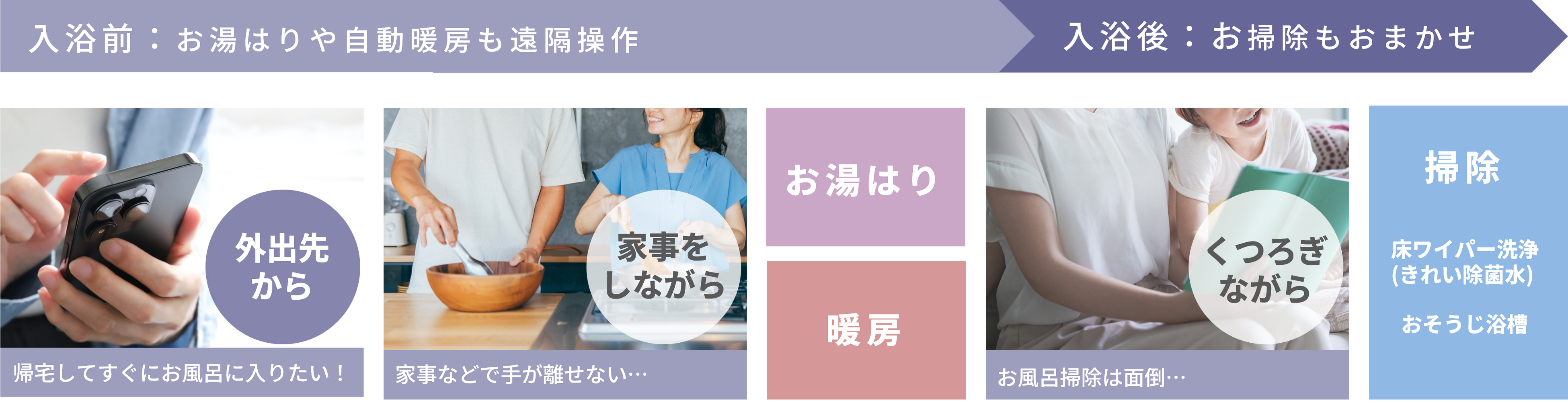 遠隔操作で外出先や家事をしながら入浴準備やお掃除が完了します。