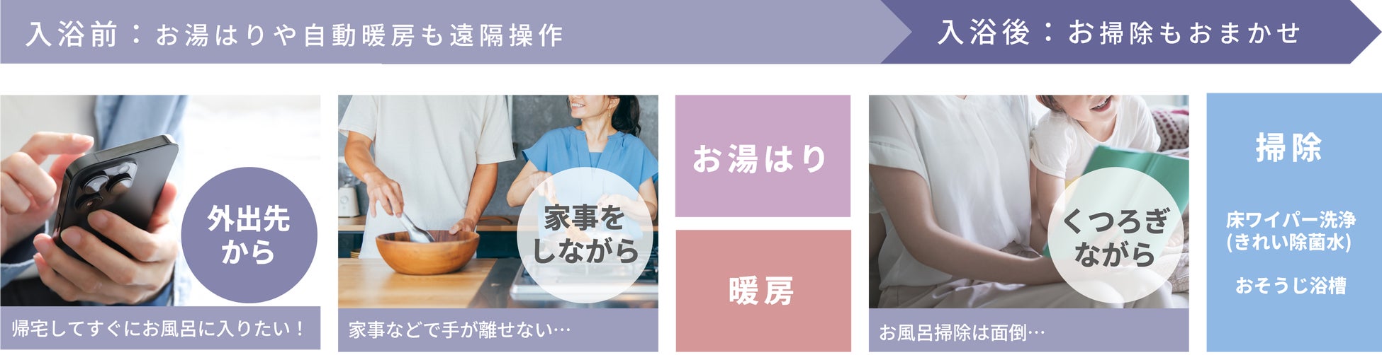 入浴前のお湯はりや、自動暖房も遠隔操作、入浴後のお掃除もスマートスピーカーやスマートフォンにおまかせ。