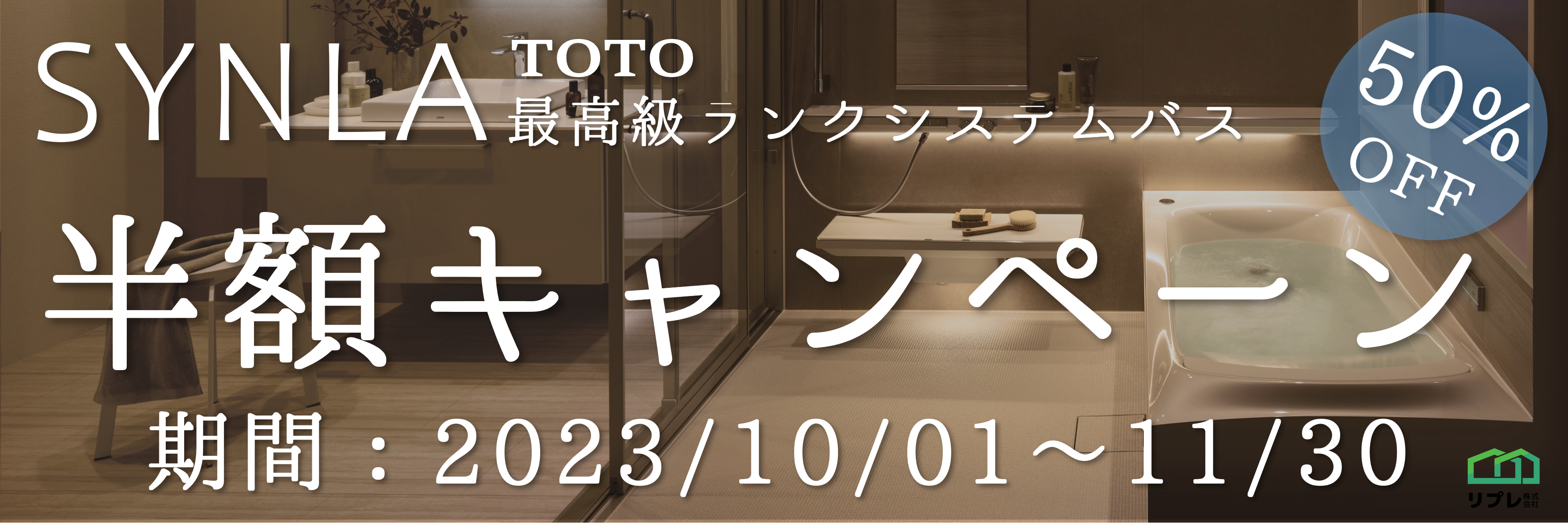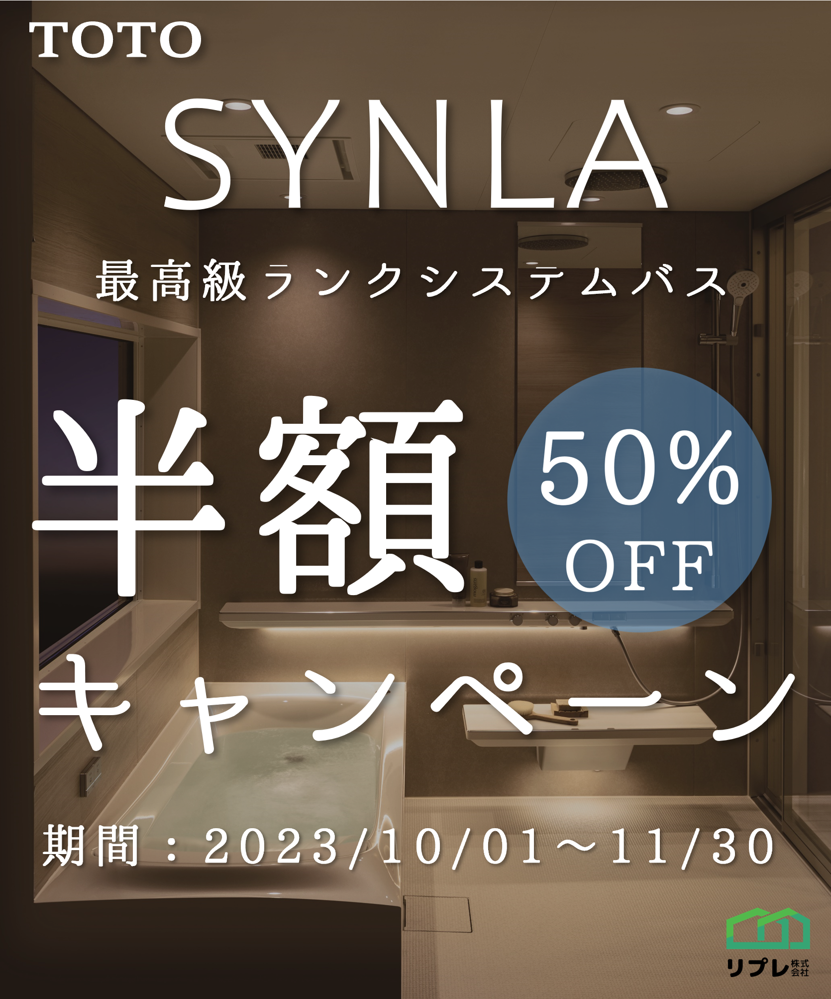 期間中にTOTO「SYNLA(シンラ)」をご契約いただき、工事が完了されたお客様は商品代を半額でご提供いたします。