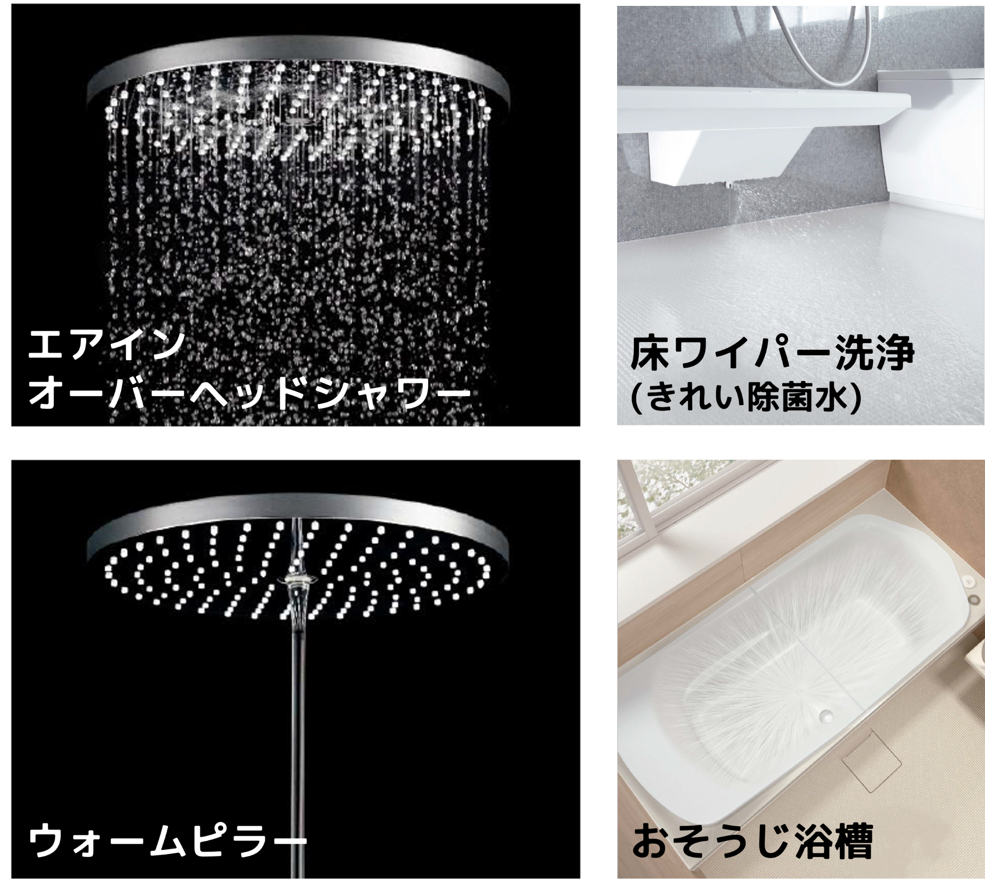 少ない水量でも満足する浴び心地のエアインオーバーヘッドシャワーと、お湯に包まれるような新感覚のウォームピラーのシャワー。2つのモードが楽しめます。