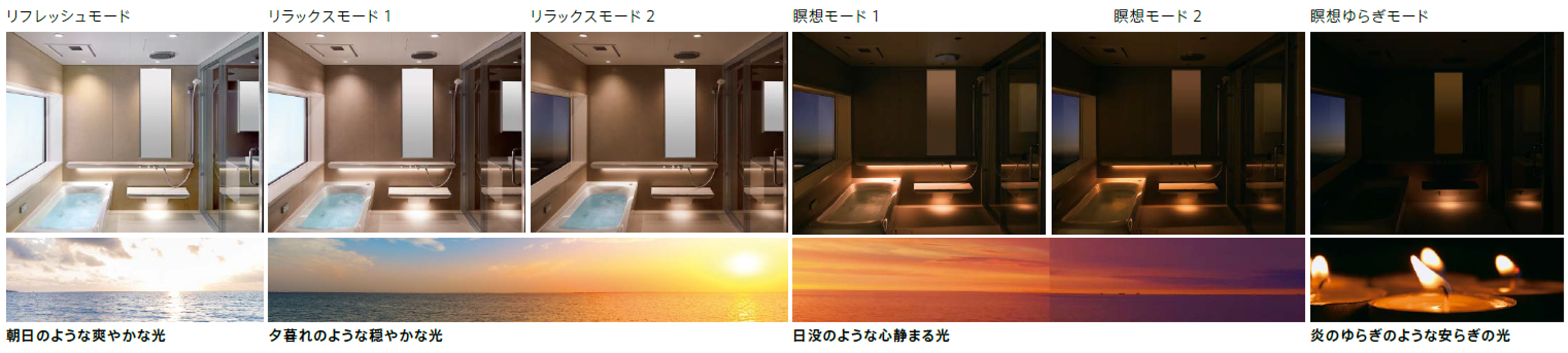6つのモードが変わるごとに点灯させる照明位置や色温度・明るさを変化させ、日の出から日没後のように1日の光を表現し、リフレッシュ・リラックスできる空間を演出します。