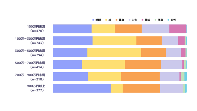 これは、収入水準によって異なる生活への興味・価値観がそれぞれの資産に影響していることが考えられます。経済的な制約がある場合、人々は互いに支え合う意識が強くなり、つながりを重要視する傾向があることから、人との「絆」の資産価値が高まるでしょう。また、家族や社会的な役割をもつ人は、家庭や社会的な繋がりなどの人間関係を重要視しているでしょう。年収900万以上等の高い収入水準の人々が時間を重要視している点については、仕事の生産性を高める方法を常に考えると共に「時間」を自己投資に使っていることが考えられます。また、時間をより効率的に利用することで、充実したプライベート時間もとりたいと考えている背景が考えられます。