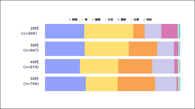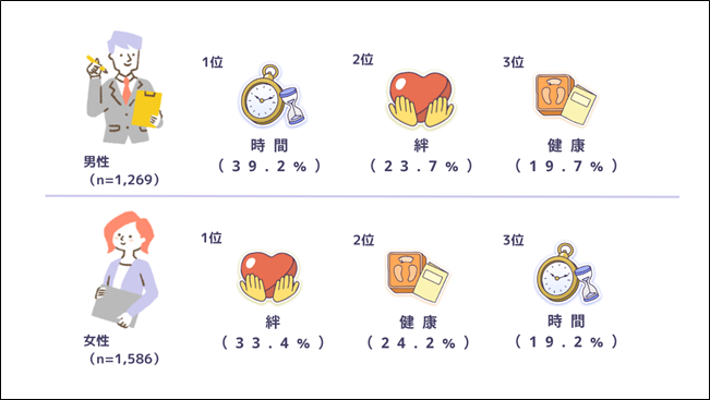 男性も女性もトップ3は、「時間」「絆」「健康」と同様の資産を大事にしています、ですが順位は異なり、男性は、「時間」を大切にしたいと考えているのに対して、女性は「絆」を重要視しているという結果になりました。