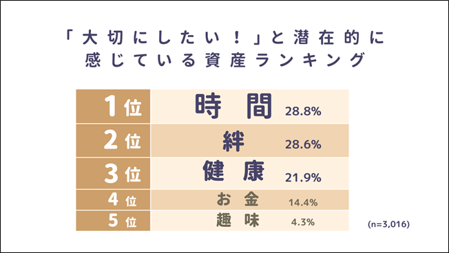 「大切にしたい」と潜在的に感じている資産の1位は「時間」の資産