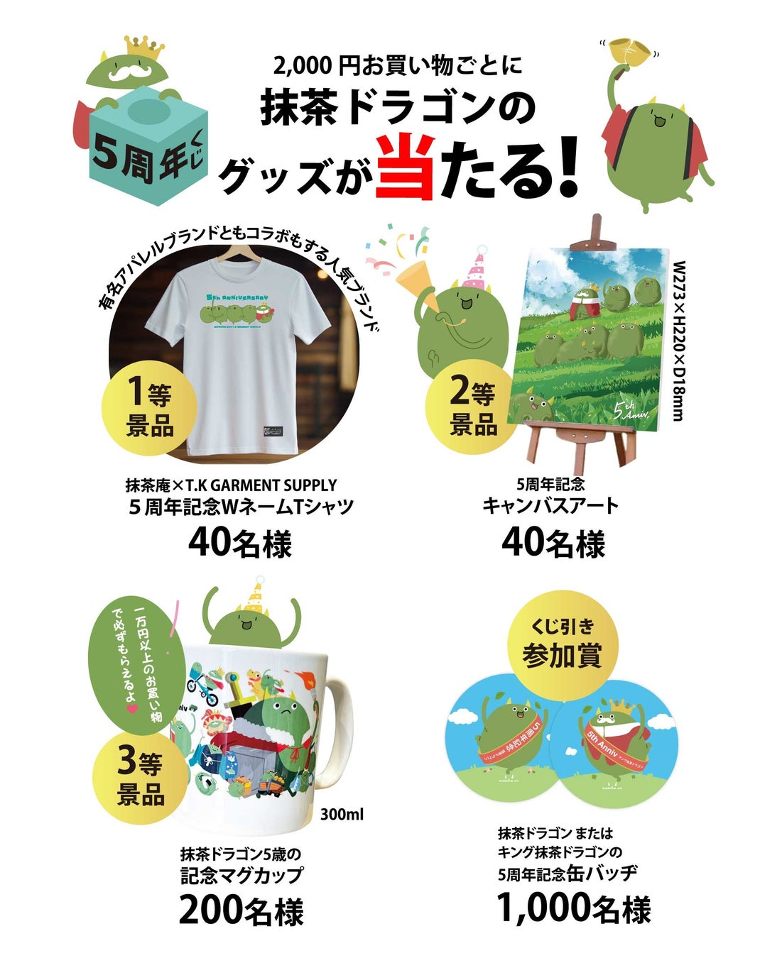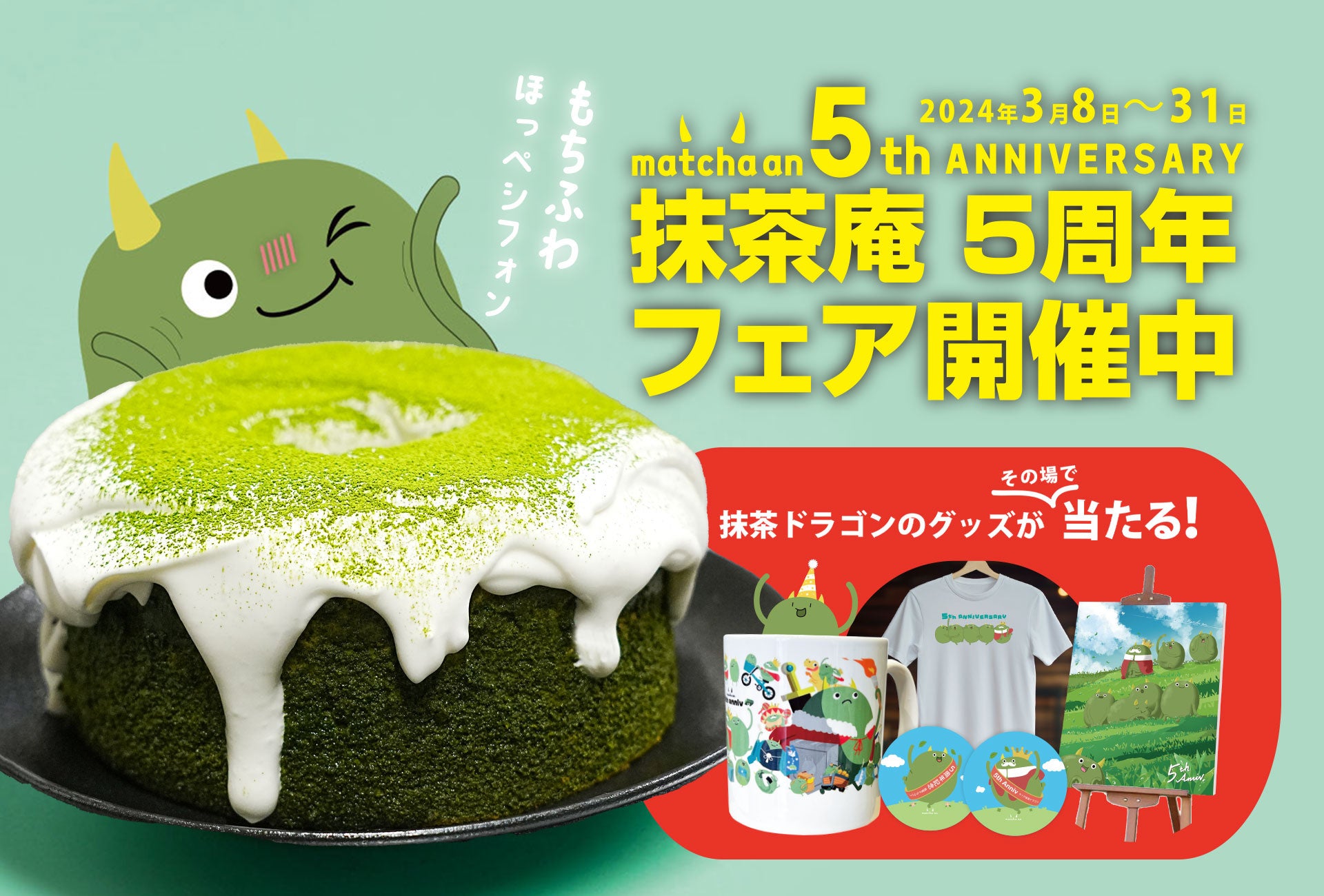 抹茶スイーツ専門店 抹茶庵は、お茶屋から誕生した抹茶スイーツ屋さん。5周年フェアでは、抹茶庵のキャラクター「抹茶ドラゴン」のほっぺたをイメージした「抹茶のもちふわほっぺシフォン」や、各種オリジナル記念グッズが当たるクジが引けます。(※オンラインストアにてご購入の場合2,000円ごとに抽選をさせていただきグッズを発送いたします)