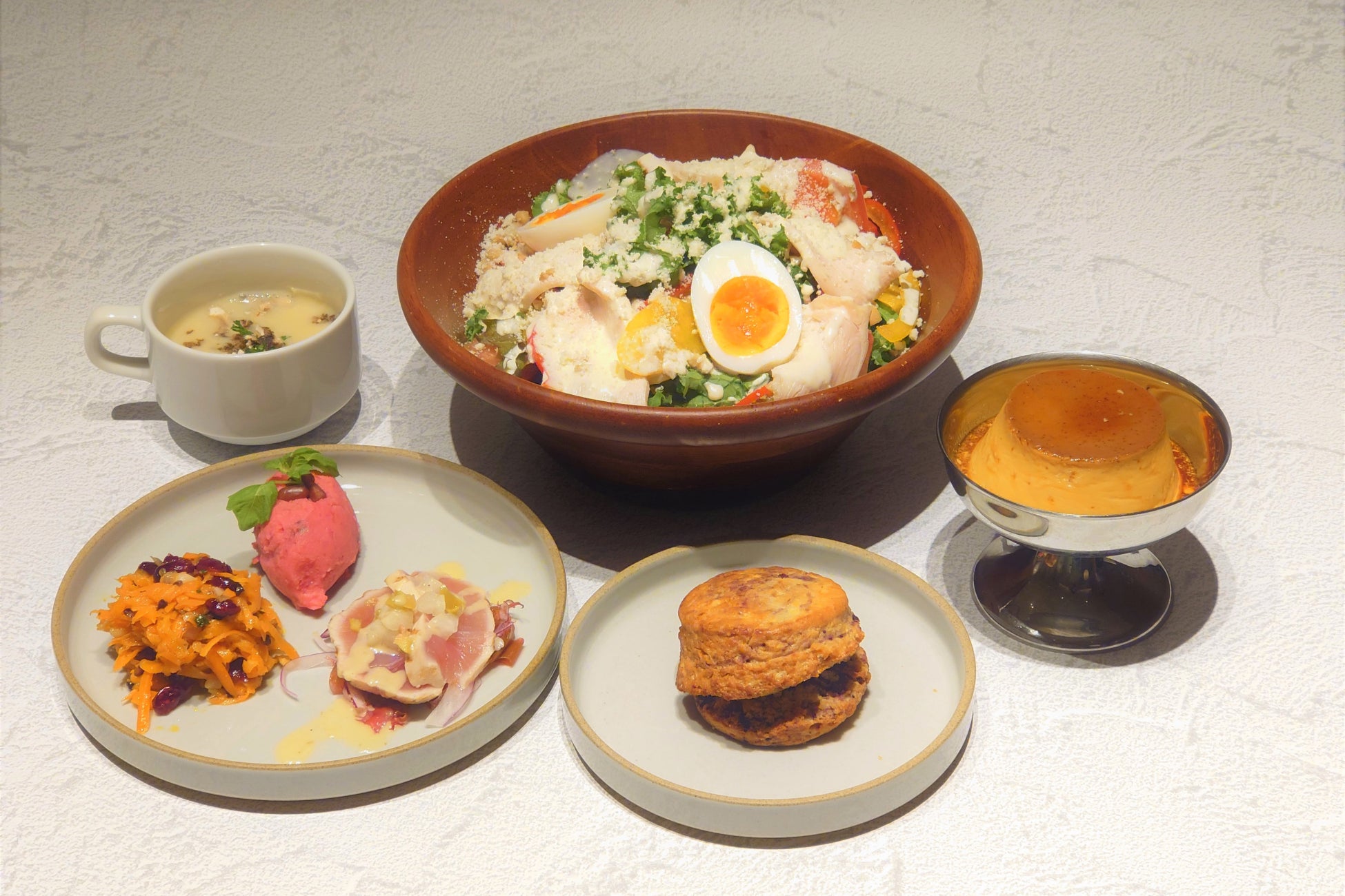 ロートレシピのランチセットで提供している季節のデリ、二十四節季(2週間)ごとに具材が変わる薬膳スープ、ブルーベリー入りスコーンのセット。
