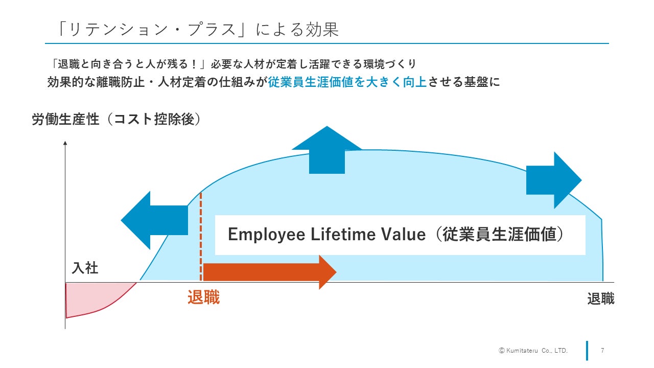 また、その後の離職対策や人材定着施策の実行・モニタリングまで専門家が伴走することにより、離職防止だけでなく、必要な人材が定着し長く活躍できるしくみを整え、従業員生涯価値の最大化を図ります。