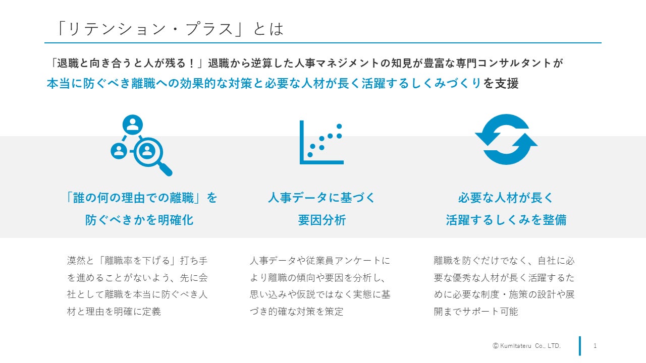 クミタテル株式会社(本社:東京都港区、代表:向井 洋平、以下「クミタテル」)は、企業の離職対策や人材定着施策を効果的に実行できるよう専門家がサポートする離職防止支援ソリューション「リテンション・プラス」をリリースしましたのでお知らせいたします。