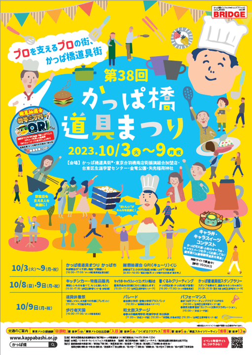 日本一の道具街として知られる東京合羽橋商店街振興組合(東京都台東区、理事長 本健太郎)では、令和5年10月3日(火)~10月9日(月・祝)までの7日間、「第38回かっぱ橋道具まつり」を、東京・かっぱ橋道具街を中心に開催いたします。コロナ渦により2年間中止となり、昨年は規模を縮小して開催いたしましたが、本年はイベント盛りだくさんで「第38回かっぱ橋道具まつり」を盛大に開催する運びとなりました。