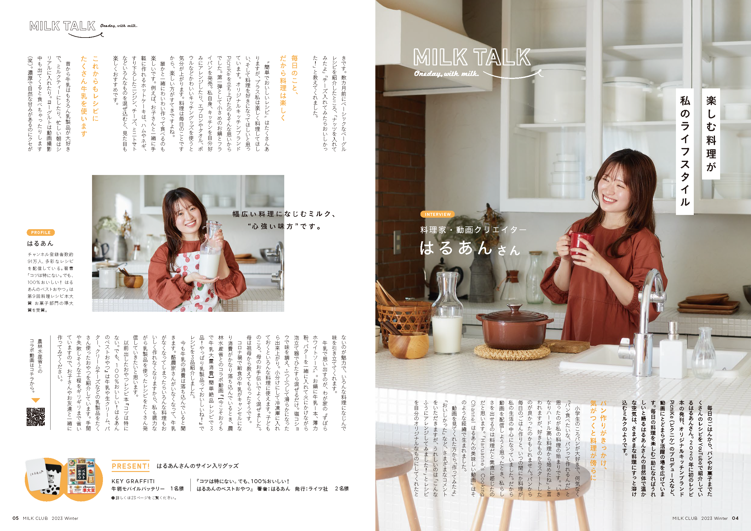 著名人・タレントなどによる酪農、牛乳・乳製品にまつわるトーク。Vol.139は料理家・動画クリエイターで、料理レシピ本大賞(お菓子部門)で準大賞を受賞した、はるあんさんが登場。料理を始めたきっかけや、自身の料理にも欠かせない牛乳・乳製品の魅力について語ります。本人のサイン入りグッズのプレゼントも!