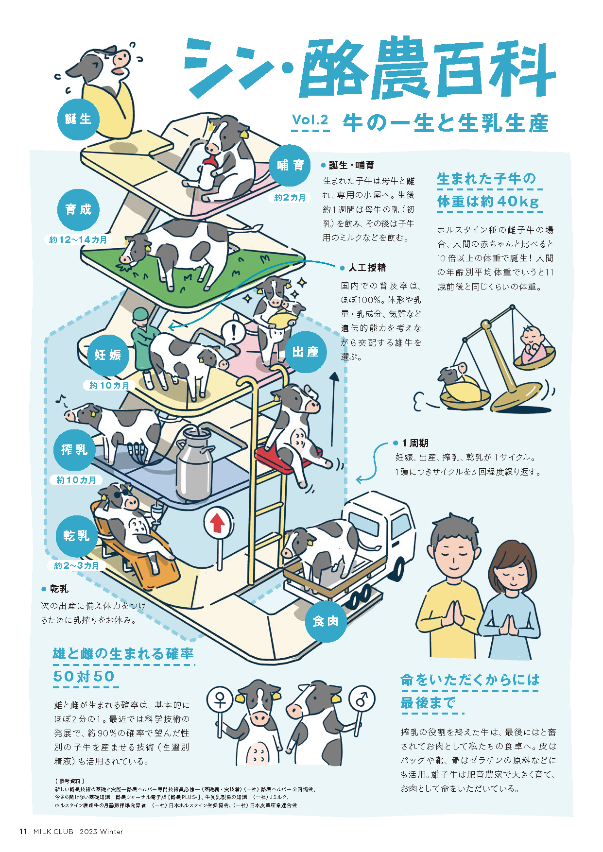 広くて深い酪農についてやさしく学べるコンテンツ。かわいいイラストが満載で、子どもと一緒に楽しめます。Vol.139は「牛の一生と生乳生産」について解説。