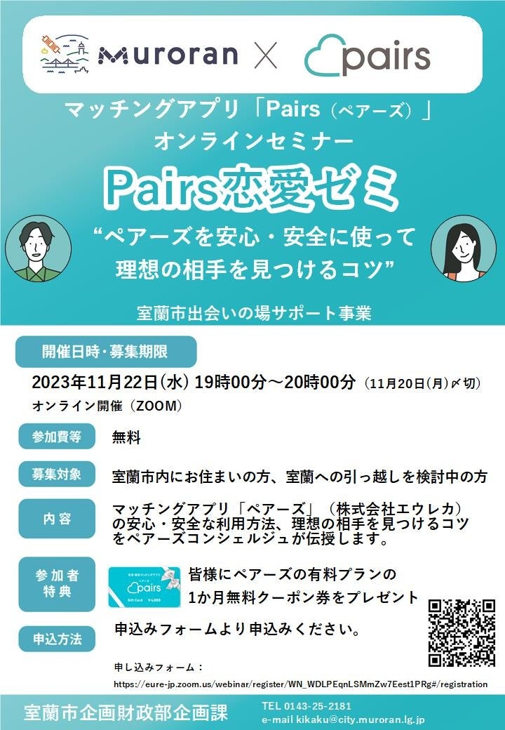 本連携は、室蘭市内の独身男女に新たな出会いの場を提供するための取り組みを実施します。マッチングアプリ「ペアーズ」の周知、普及を通し、出会いを求める独身男女への出会いの機会を創出します。