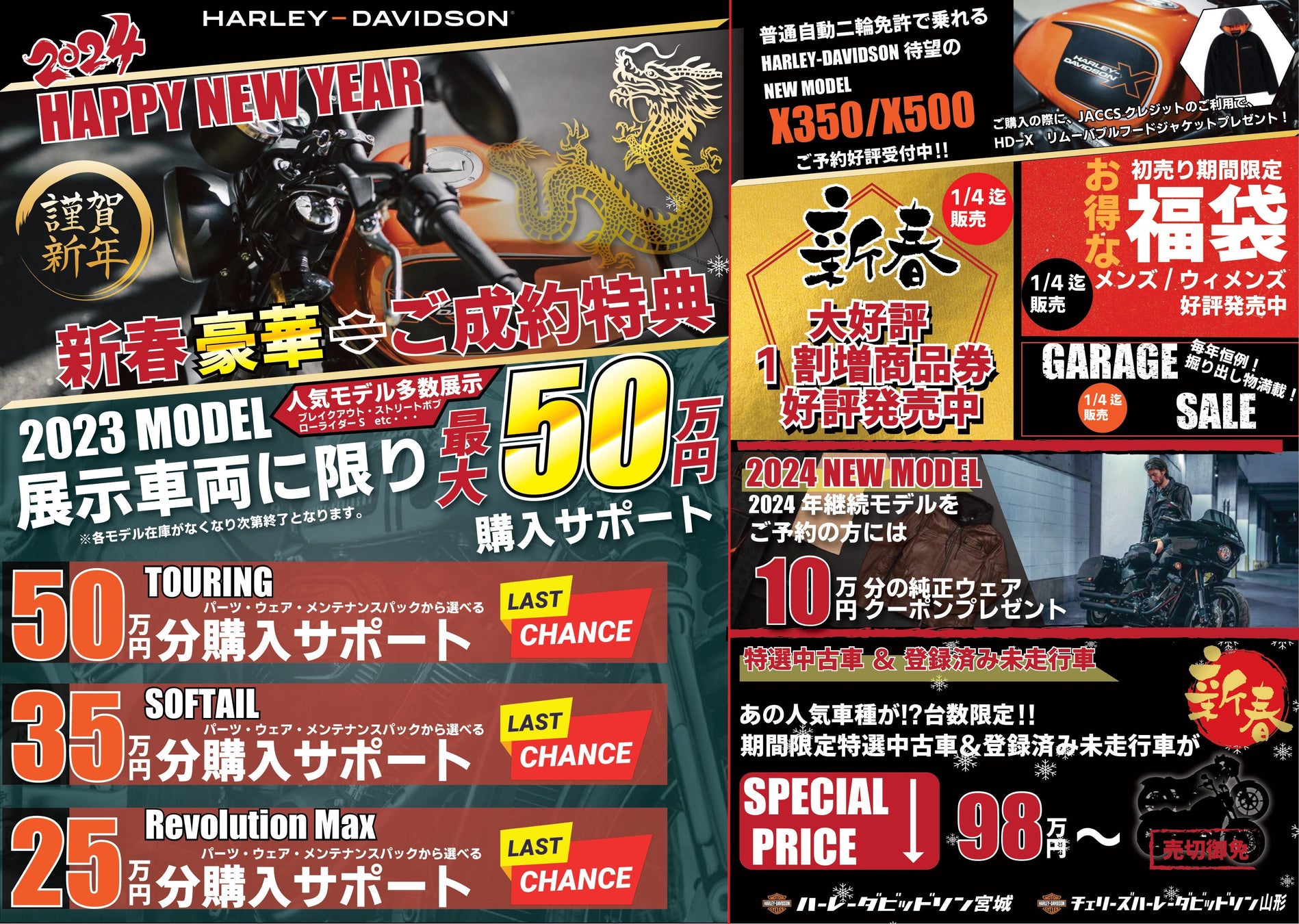 ハーレーダビッドソンでは、2023年モデルをご成約の方には最大50万円の購入サポート付き! その他優良中古車や、登録済み未走行車両を初売り特価にて大放出!さらに中古車をご成約の方には、安心の2年延長保証をお付けしてご納車いたします。