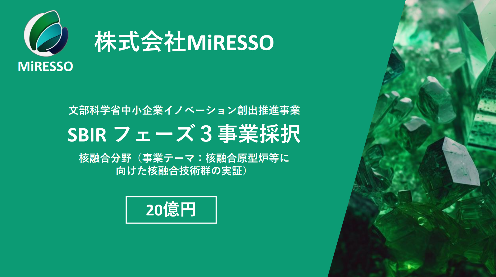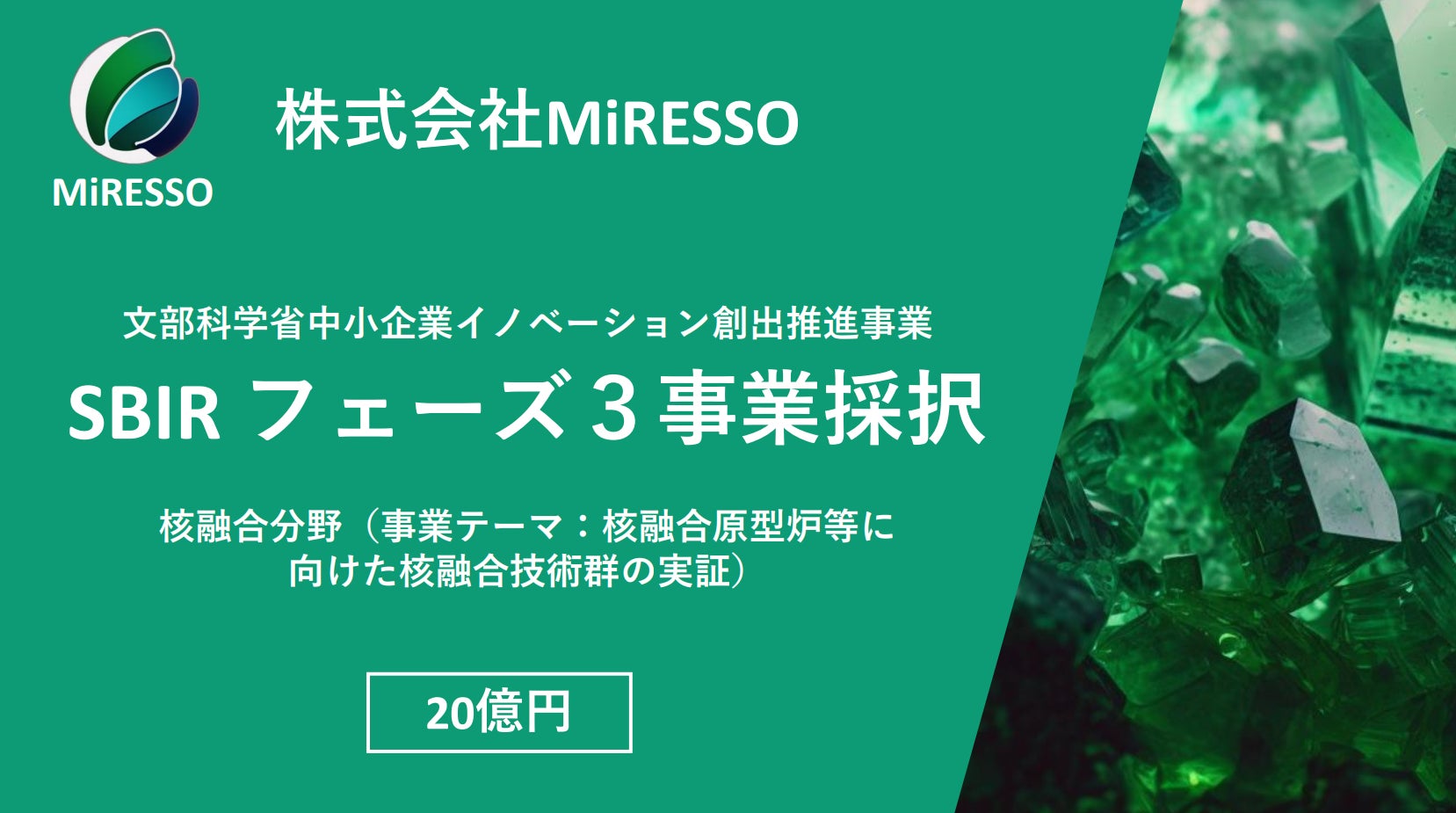 株式会社MiRESSOが文部科学省の中小企業イノベーション創出事業(SBIRフェーズ3)に採択(20億円)
