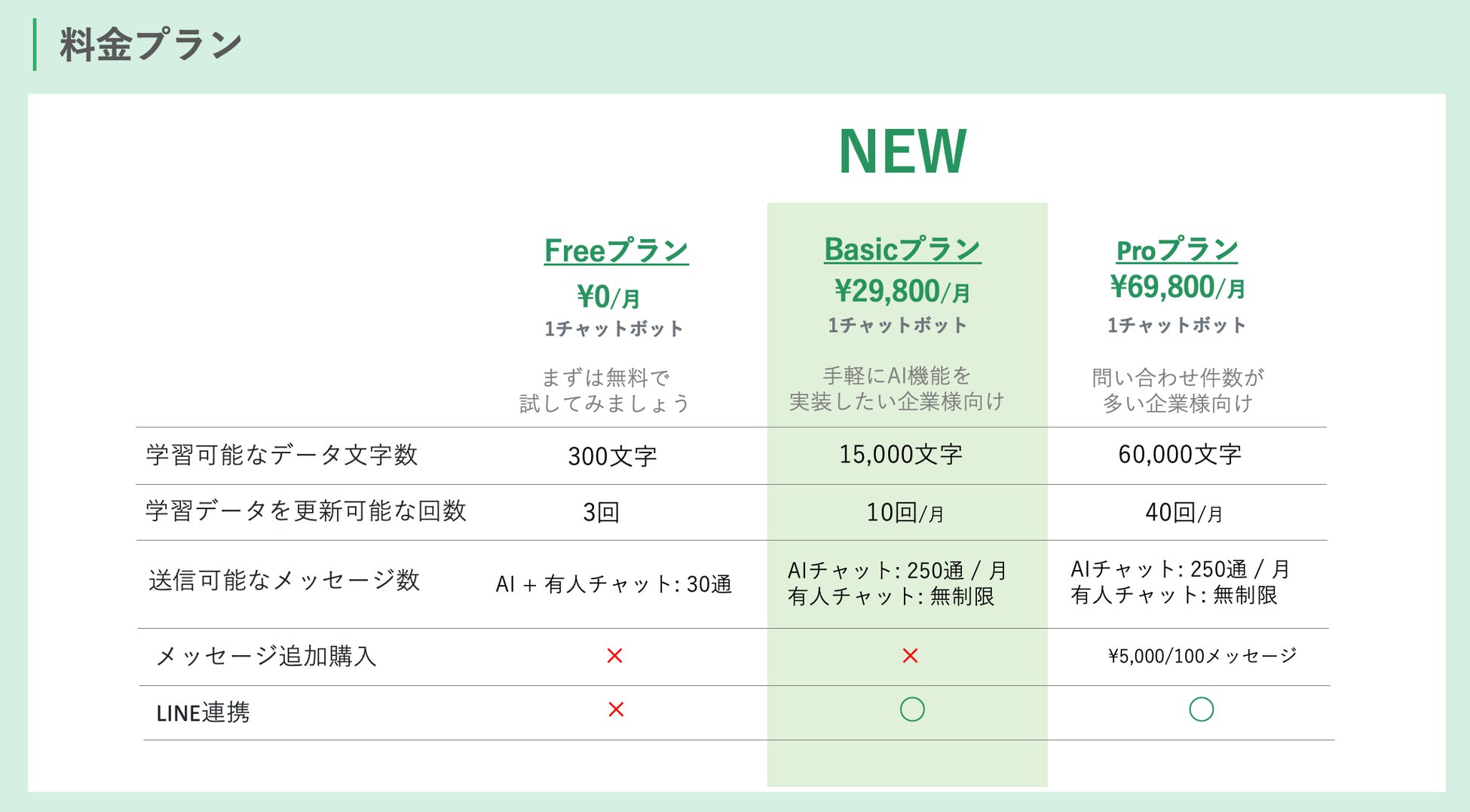 Basicプランは、特に低価格で基本的なAI機能が必要なお客様向けにデザインされています。¥29,800という手頃な価格で、ウェブサイトに簡単に組み込み可能で、必要な情報を読み込ませるだけでAIによる対応が自動的に始まります。