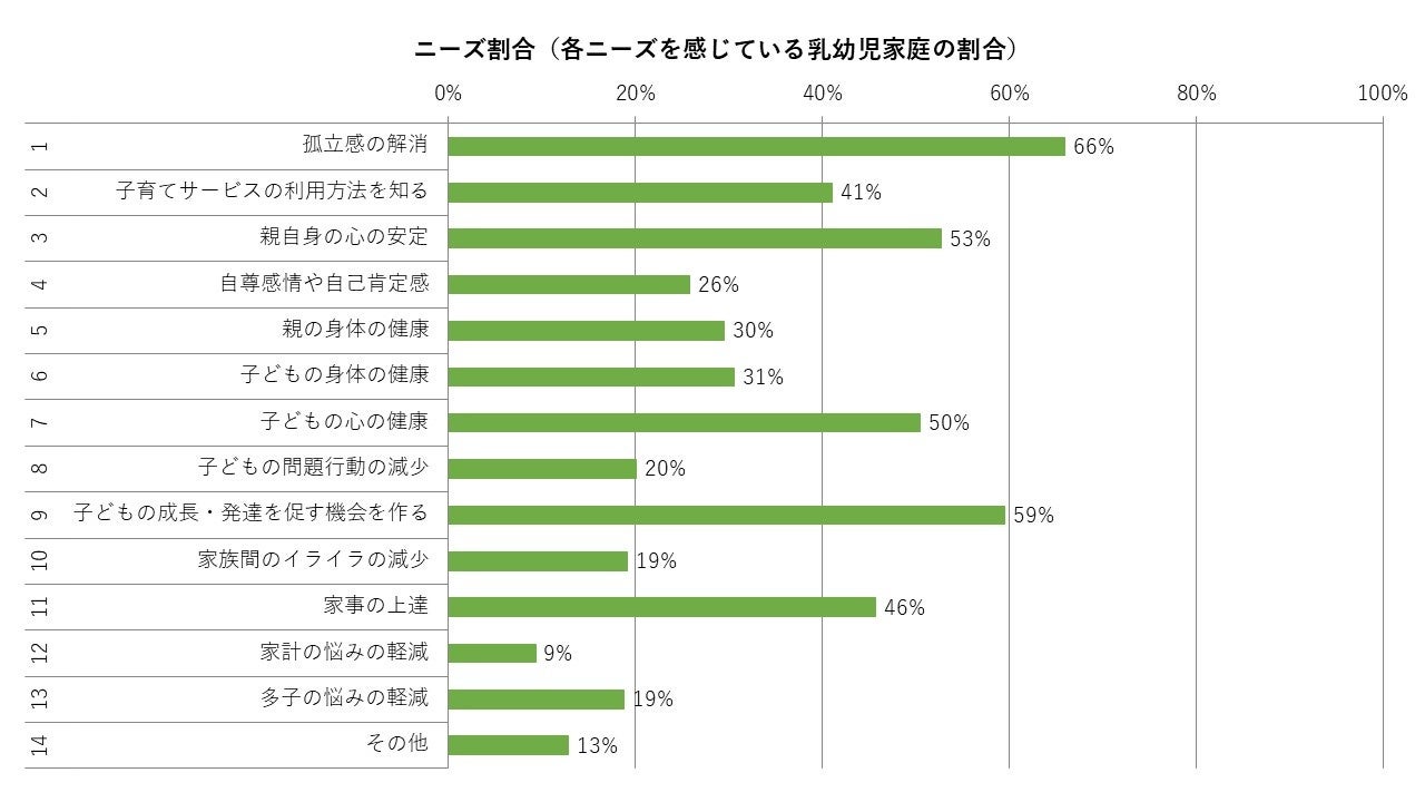 ニーズの第1位は「孤立感の解消」で、全利用家庭の66%にのぼり、集計を始めてから常にトップです。第2位は「子どもの成長や発達の機会を作る」で59%、第3位は53%で「親自身の心の安定」です。親が自身の孤立感や不安を抱えながらも、子どもの健やかな成長や発達に力を尽くしたい気持ちがうかがえます。