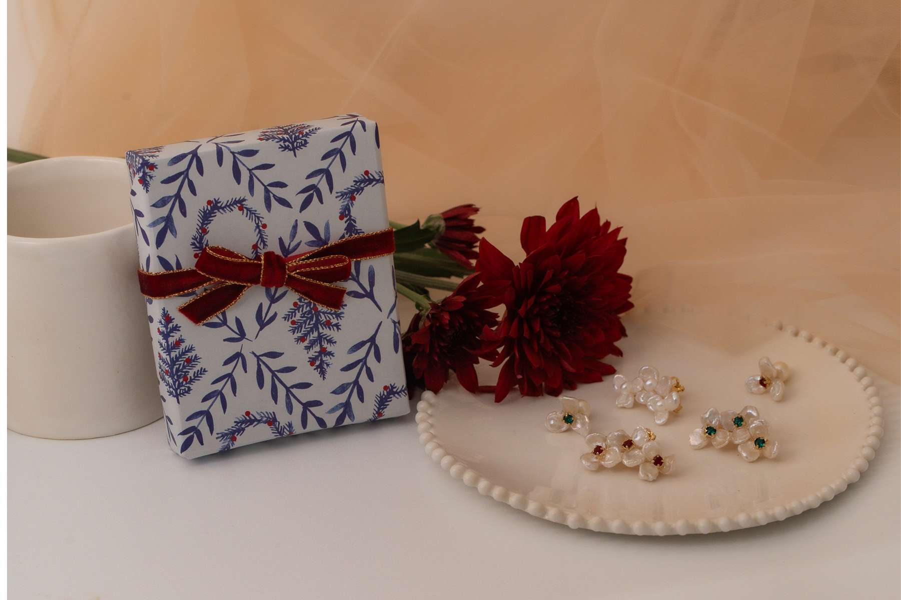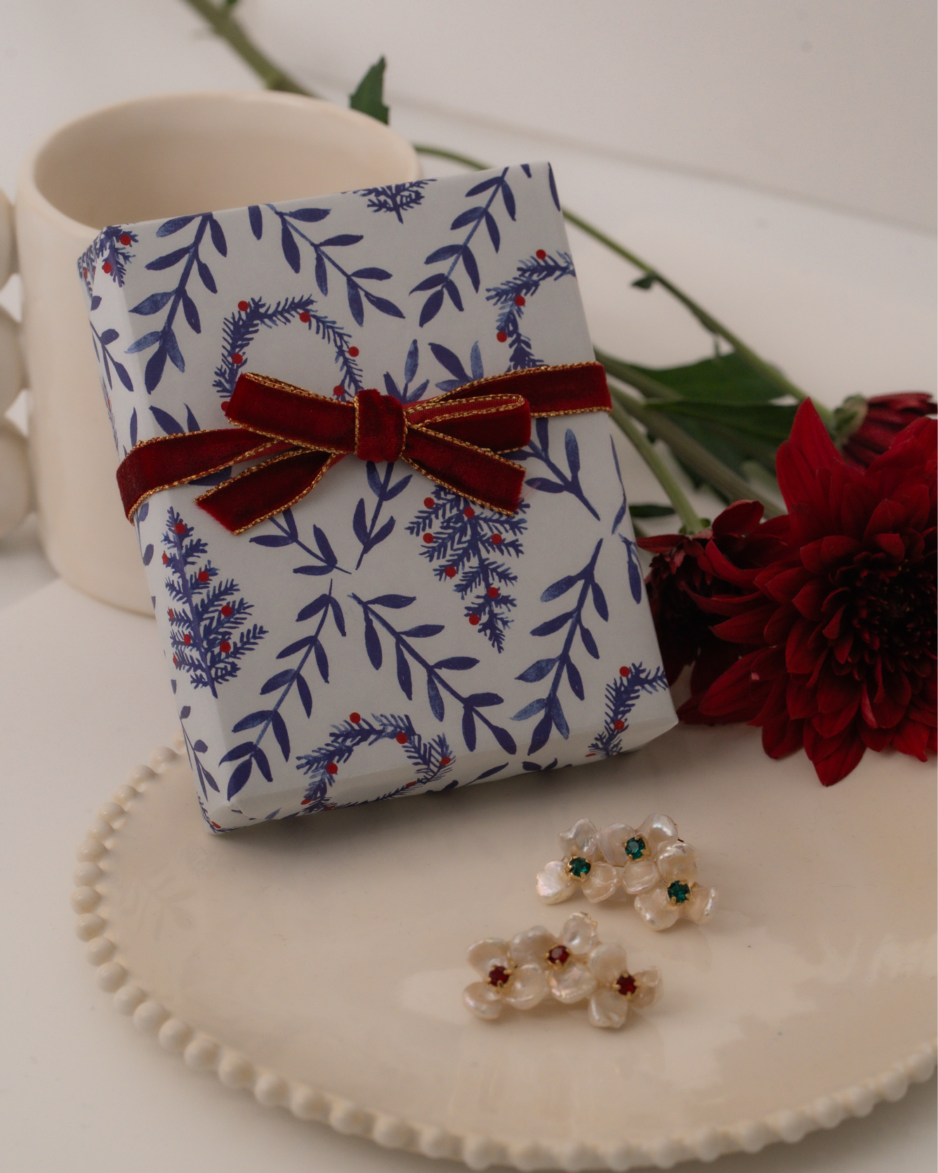 クリスマスコレクション期間中にご購入いただいたすべてのアイテムはホリデームードが漂うラッピングでお届けします。ご褒美となるようなときめきをジュエリーと共に感じていただけますように。