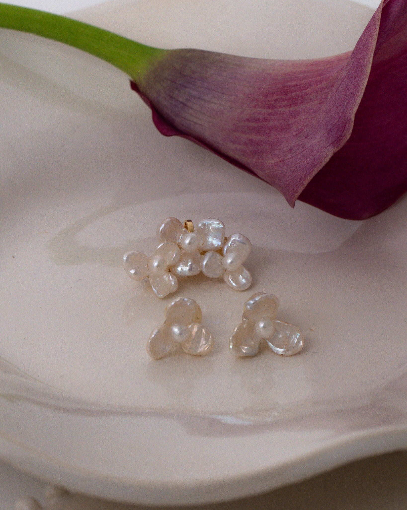 手作業でひとつひとつパールを紡ぎ、お花に仕立てたアクセサリーたちは、ギフトにもおすすめです。重ね付けをすると、ぐんと華やかな印象に。天然素材ならではの唯一無二の出会いを楽しんでいただけますように。