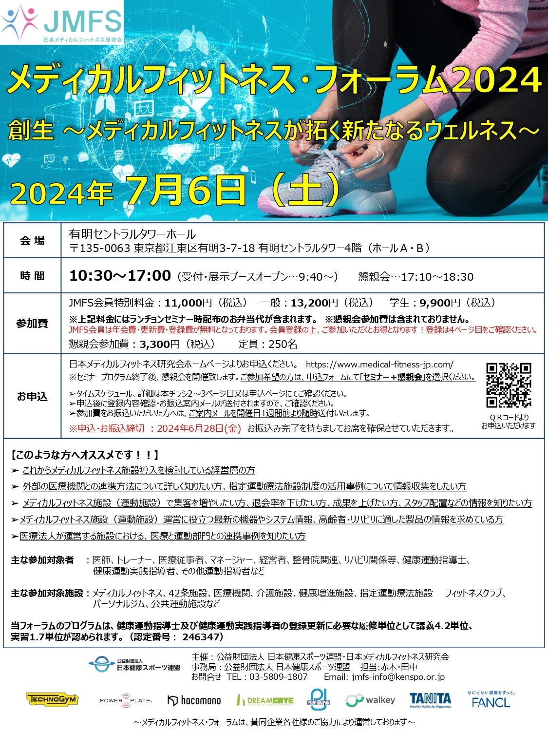 日本メディカルフィットネス研究会/公益財団法人日本健康スポーツ連盟は、メディカルフィットネスの更なる普及・促進を目的に「メディカルフィットネス・フォーラム2024」を7月6日(土)に開催いたします。