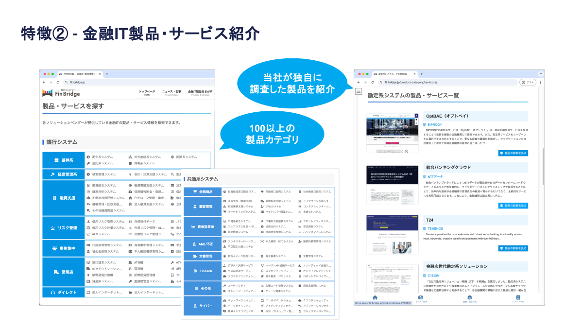 100以上のカテゴリにわたる金融IT製品・サービス情報を掲載。金融機関のユーザはニーズに合った製品を検索し、登録済製品の資料請求が可能です。また、ITベンダやFinTech企業のユーザは効率的に金融機関にアプローチできます。