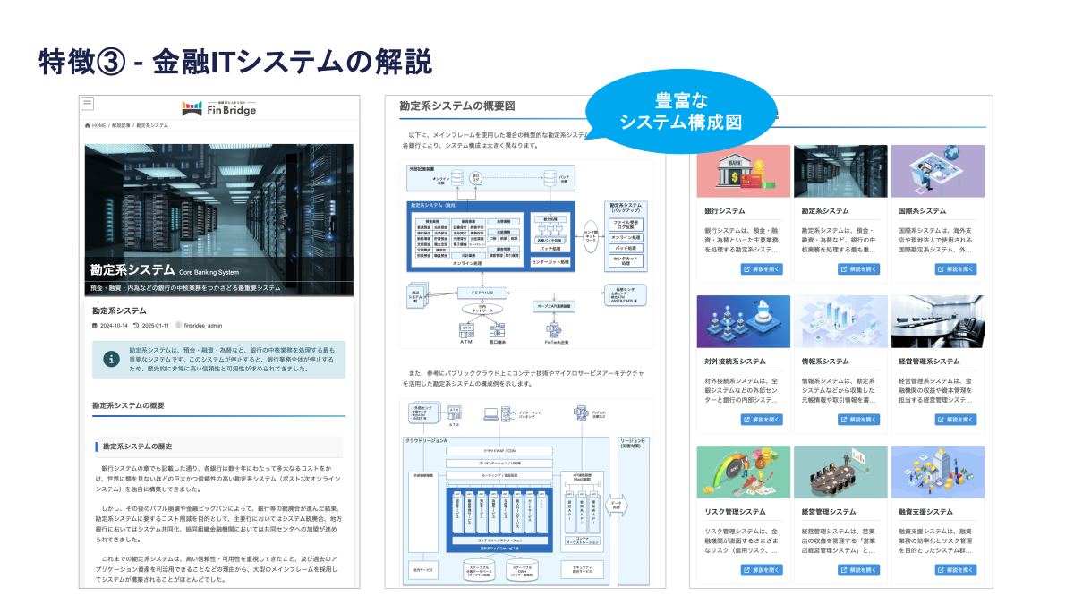 金融ITシステムの動向解説や、監督指針・各種ガイドラインのExcel版の提供など、金融機関におけるシステム理解の促進や業務効率化を支援する独自コンテンツを展開します。