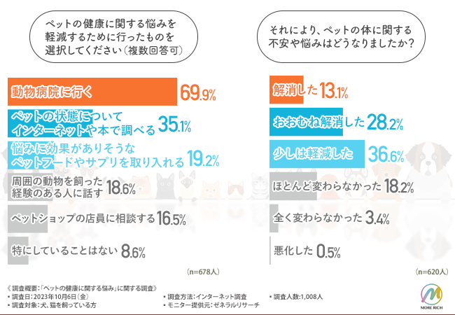 主に動物病院に行くことで悩みを軽減しようとしている方が多いということが分かります。また、悩みに効果がありそうなペットフードやサプリを取り入れている方もいることが明らかになりました。