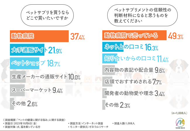 ペットサプリを選択する際、信頼要因として「動物病院で売っている」という回答が最も多かった点から、専門家(獣医師)が推奨する、あるいは販売していることで製品に対する信頼性が高まるということが明らかになりました。