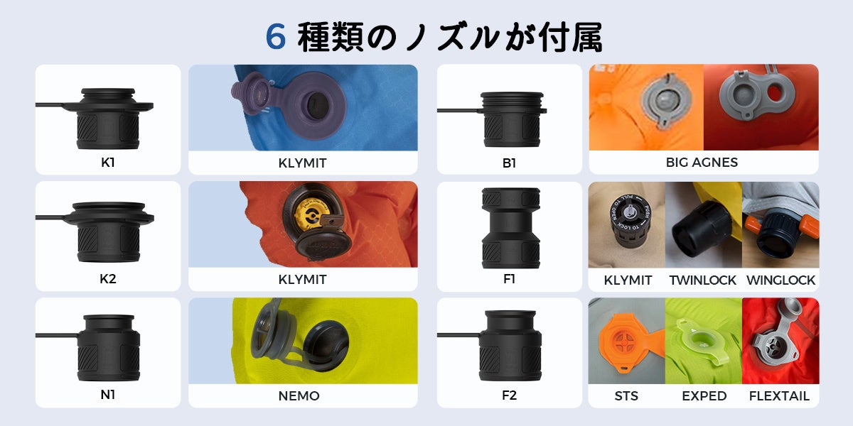 6種類のノズルが付属しており、世界中のブランド(THERM-A-REST、KLYMIT、NEMO、SEA TO SUMMIT、BIG AGNES、EXPEDなど)のバルブに対応しています。