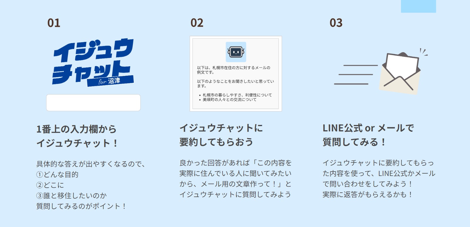 ① AIの活用により沼津市への移住関心層・移住検討者が気軽に質問・相談できる