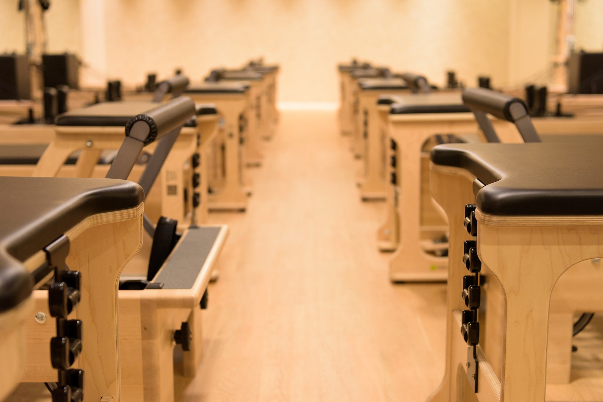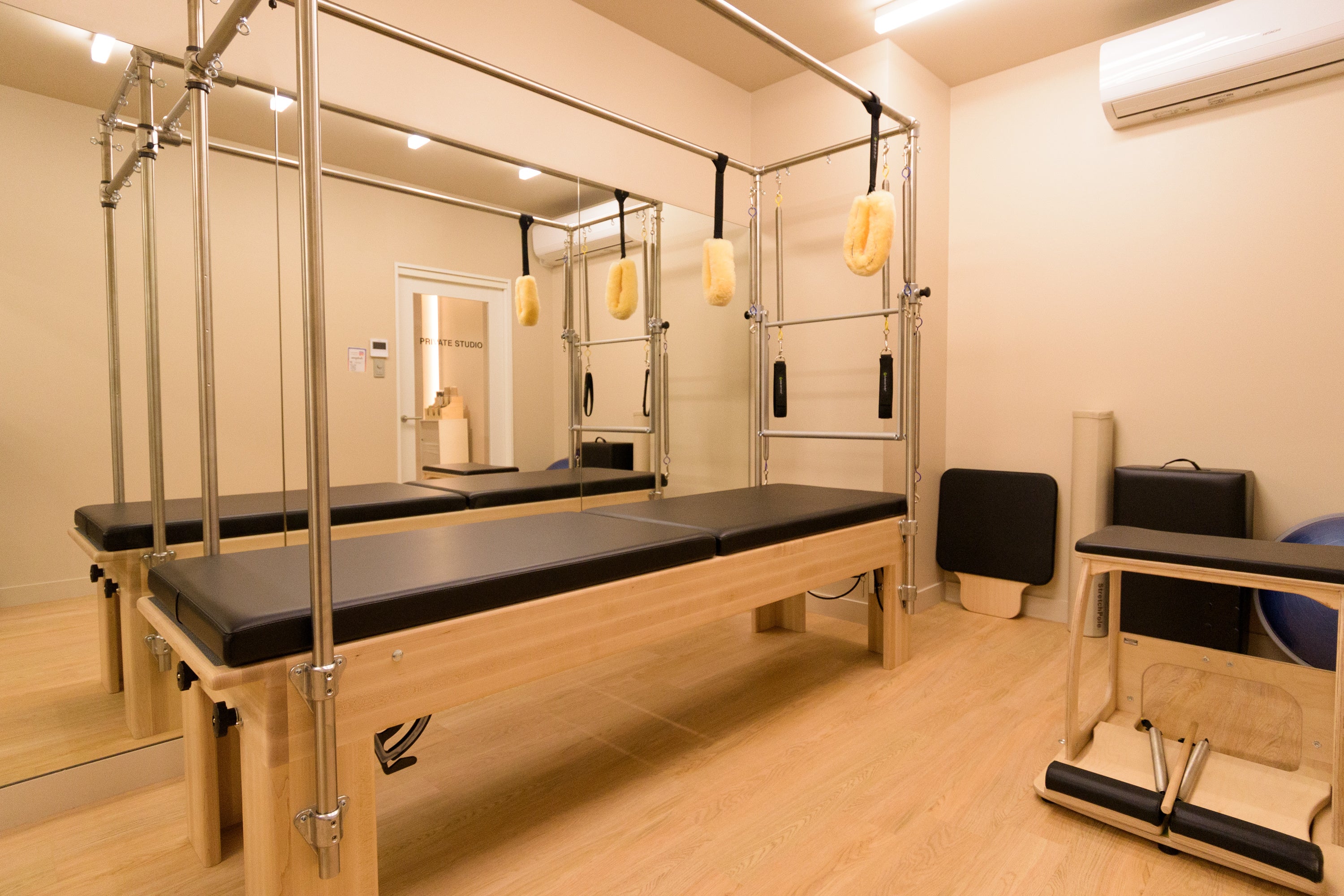 リフォーマーと呼ばれるピラティスマシン12台に加え、チェア、TRX、スパインコレクター、フォームローラー、BOSUボールなどの大小様々なピラティス専用器具を完備。