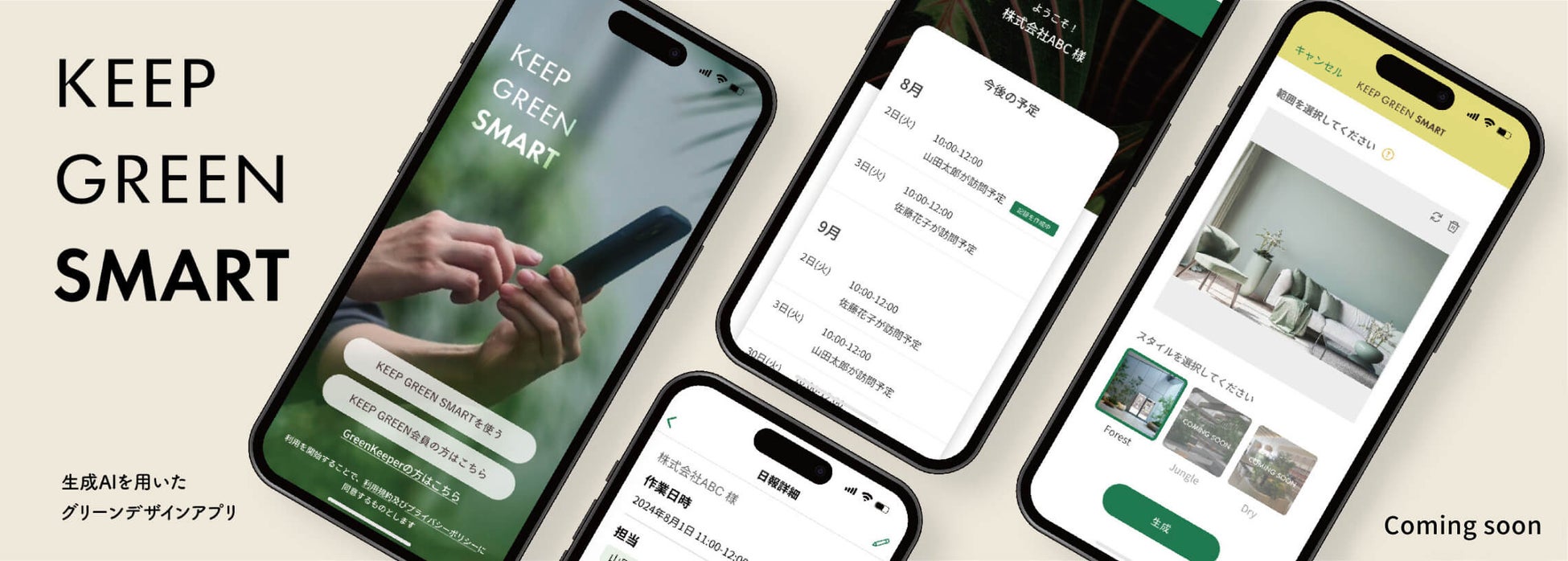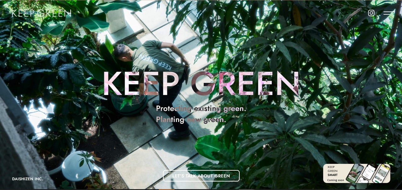 「KEEP GREEN」はDAISHIZENが2024年9月よりスタートした、全国の主要都市をネットワークしグリーンと人をつなぐ新たなプラットフォームです。グリーンのエキスパート達による植物の施工・メンテナンスをはじめ、プロにも選ばれるプロダクト開発・販売、ストア運営。そして、2024年秋には、GreenSnap 社と共同開発した「KEEP GREEN AI」を用いた、グリーンデザイン機能を搭載したアプリ「KEEP GREEN SMART」を展開します。